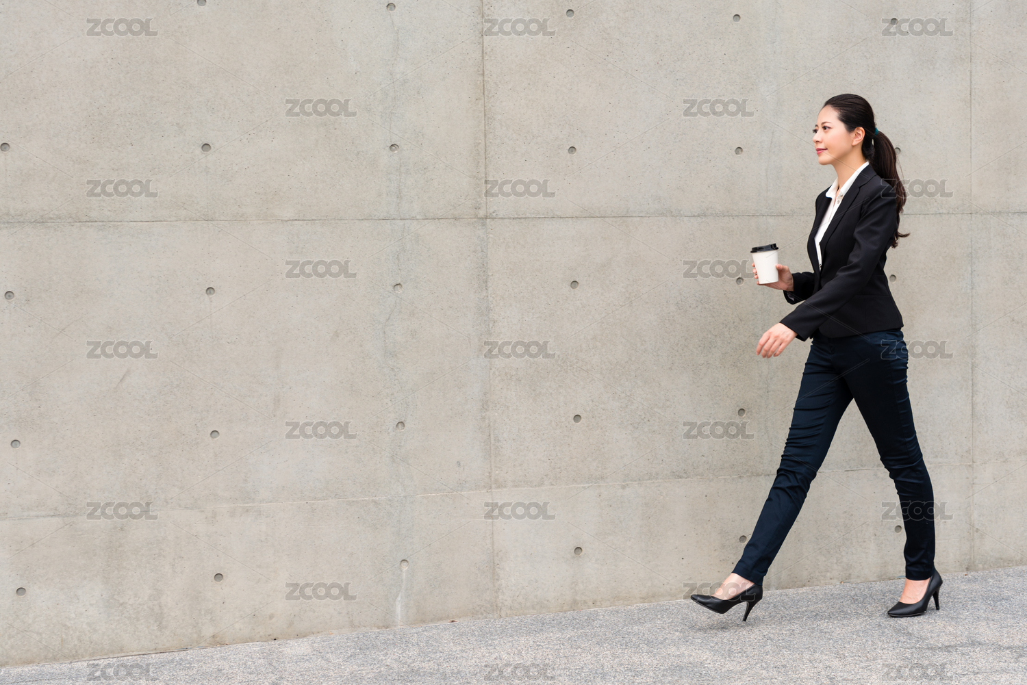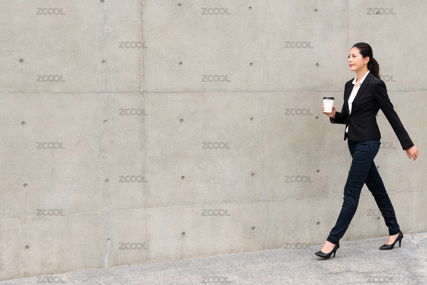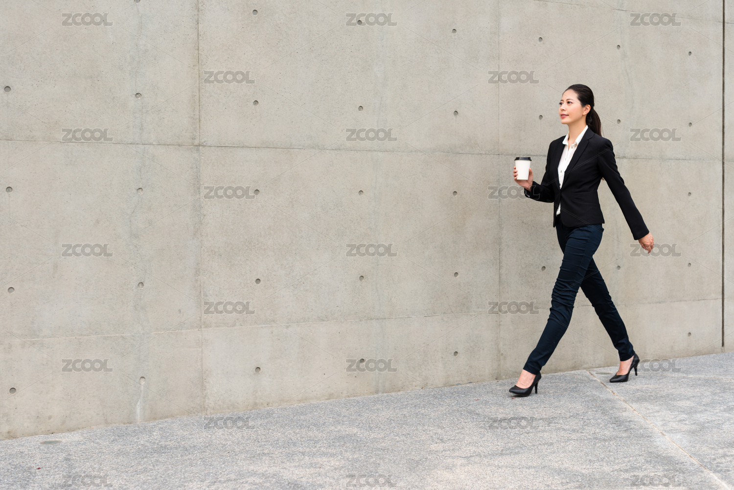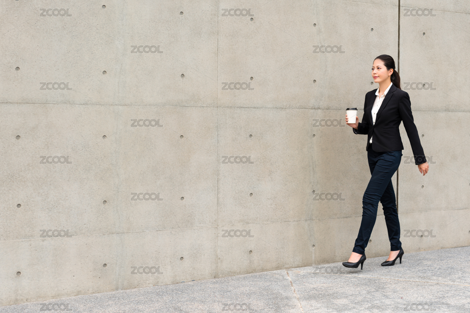 在灰墙上背景自信的业务小姐步行人行道的户外走廊拿着热咖啡一杯咖啡准备去办公室开会。