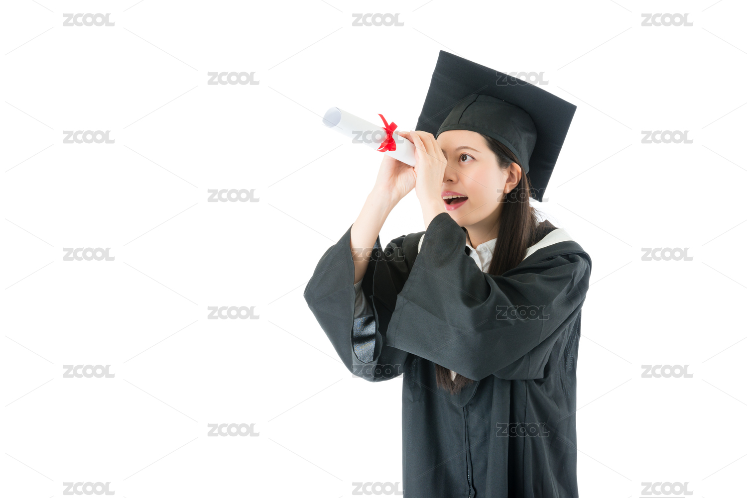 美丽漂亮的女研究生使用文凭奖纸来看未来,为自己隔绝在白色背景寻找最佳方案。