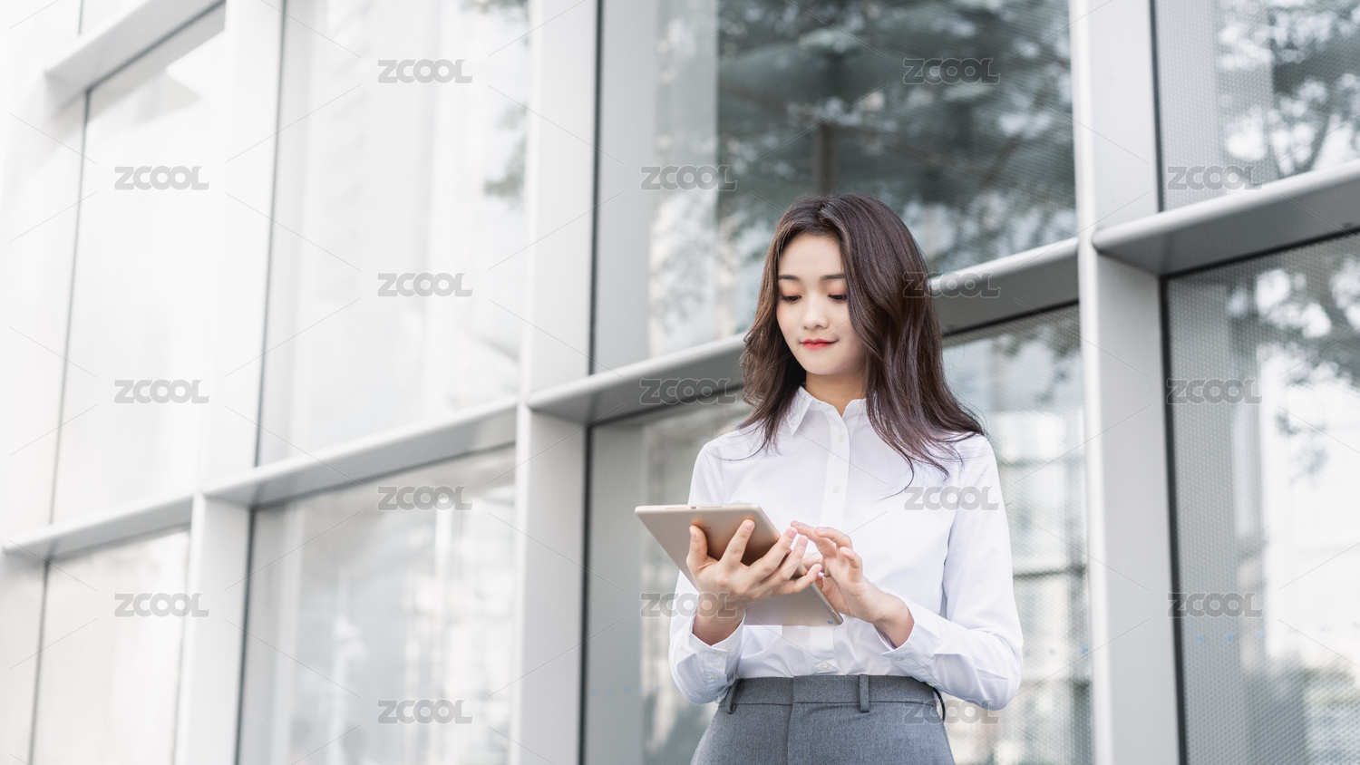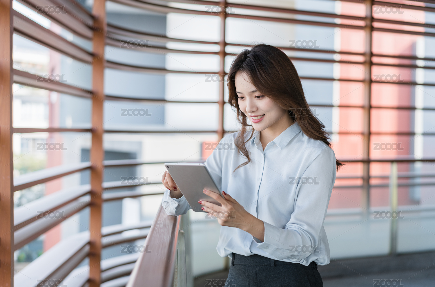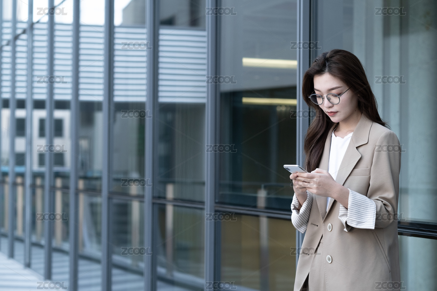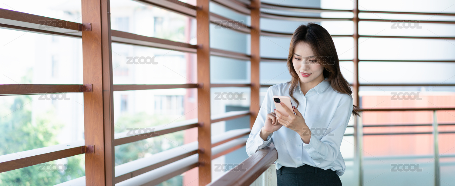 优雅的上班族女孩使用移动手机联络公司同事讨论站在城市建设的思考窗口室外走廊的工作进展情况。