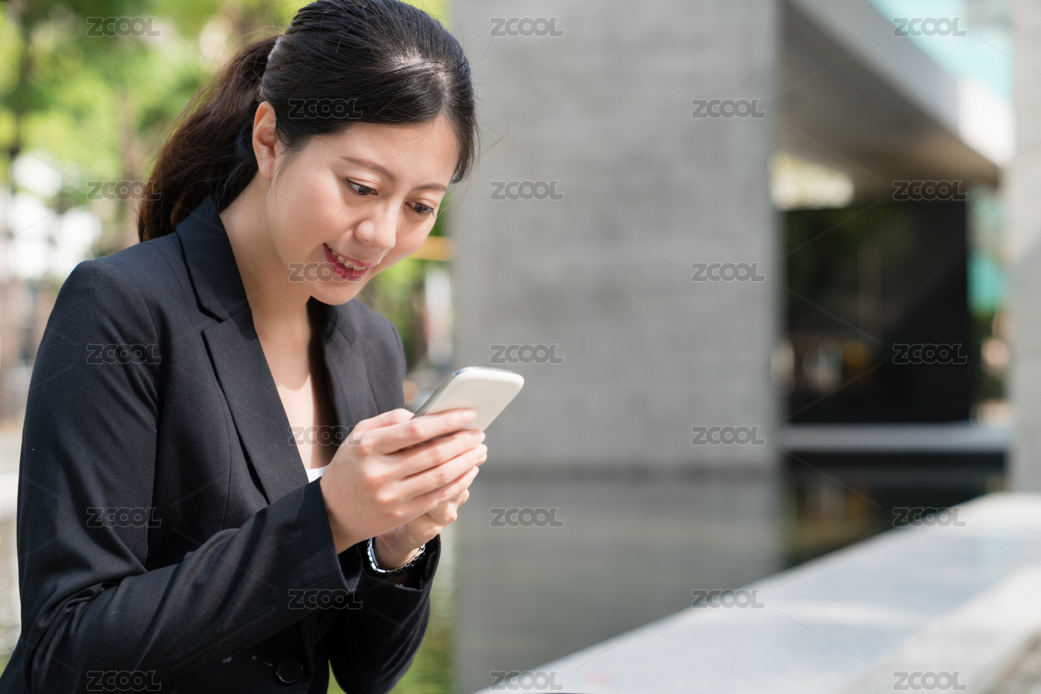 微笑的女士开心地看着移动手机浏览在现代建筑的窗户在空闲的时候您在户外放松最新的在线信息,新闻的地位。