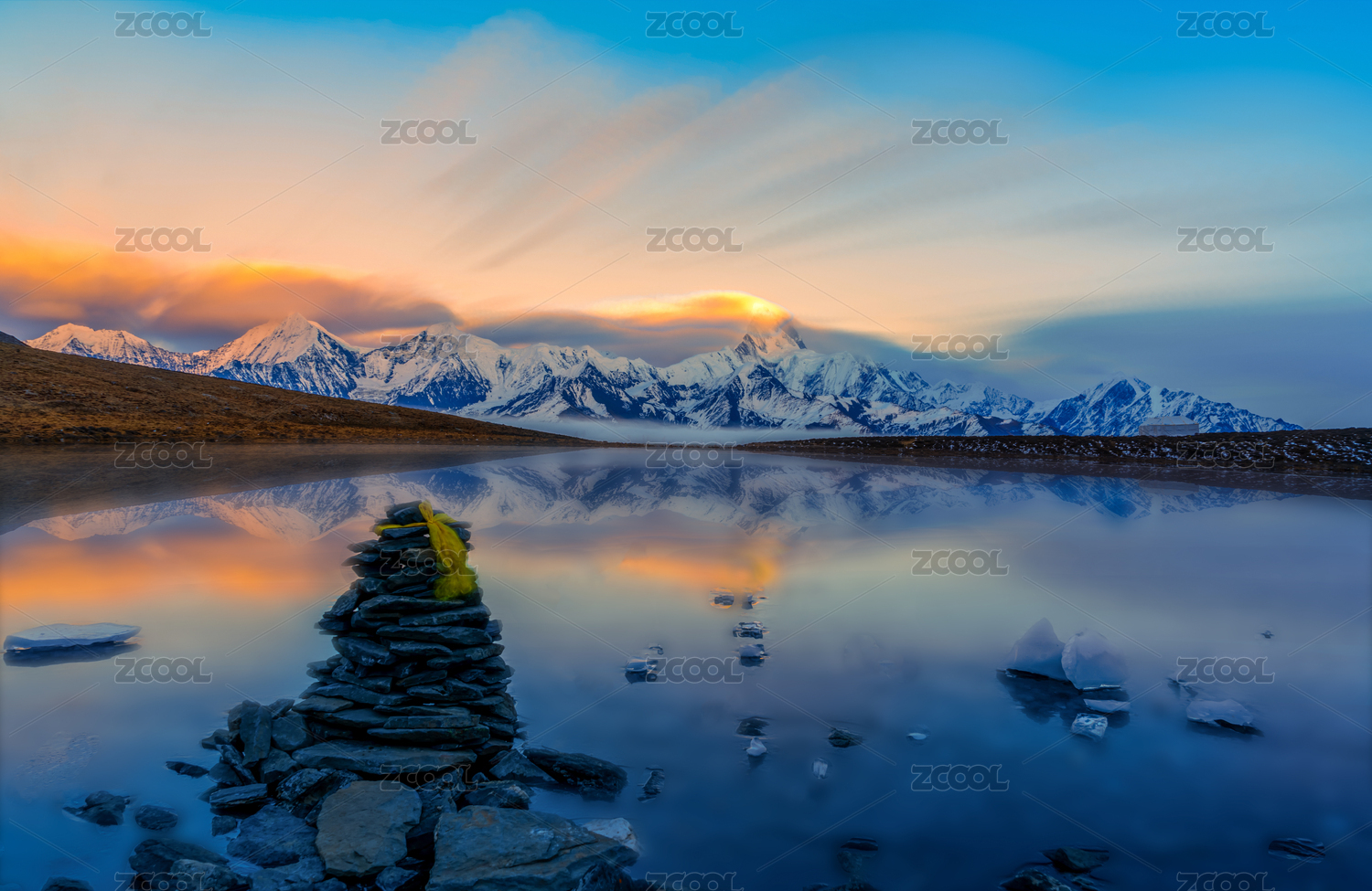 积雪覆盖的中国贡嘎雪山,与结冰的蓝色湖面