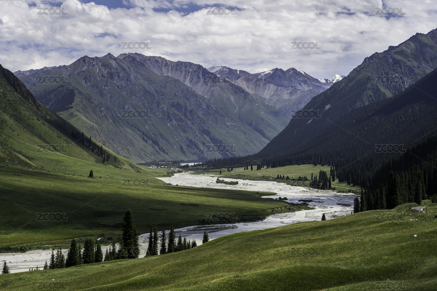 中国新疆伊犁昭苏夏塔草原雪山自然风光