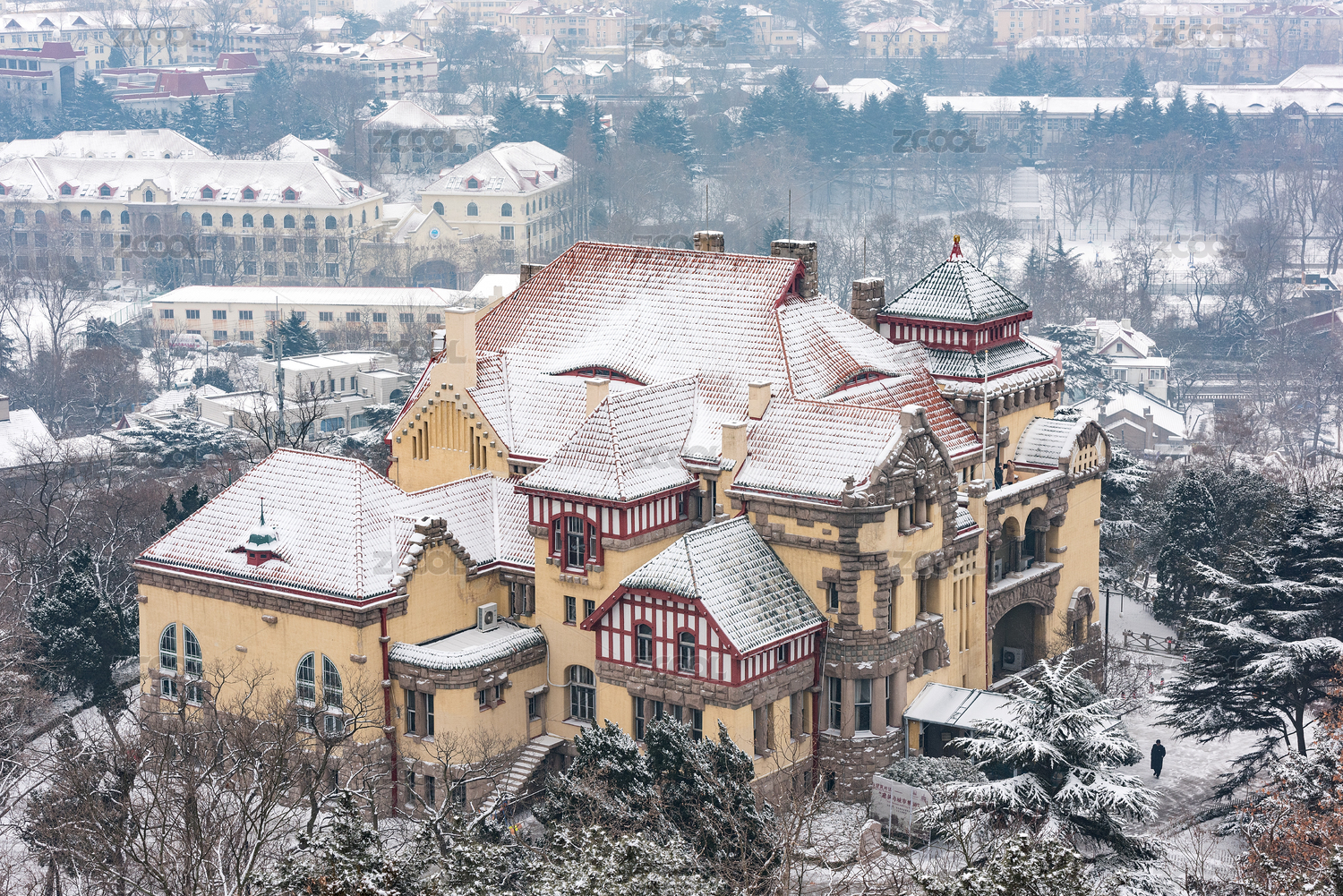 冬季青岛市城市雪景航拍(胶澳总督府旧址)