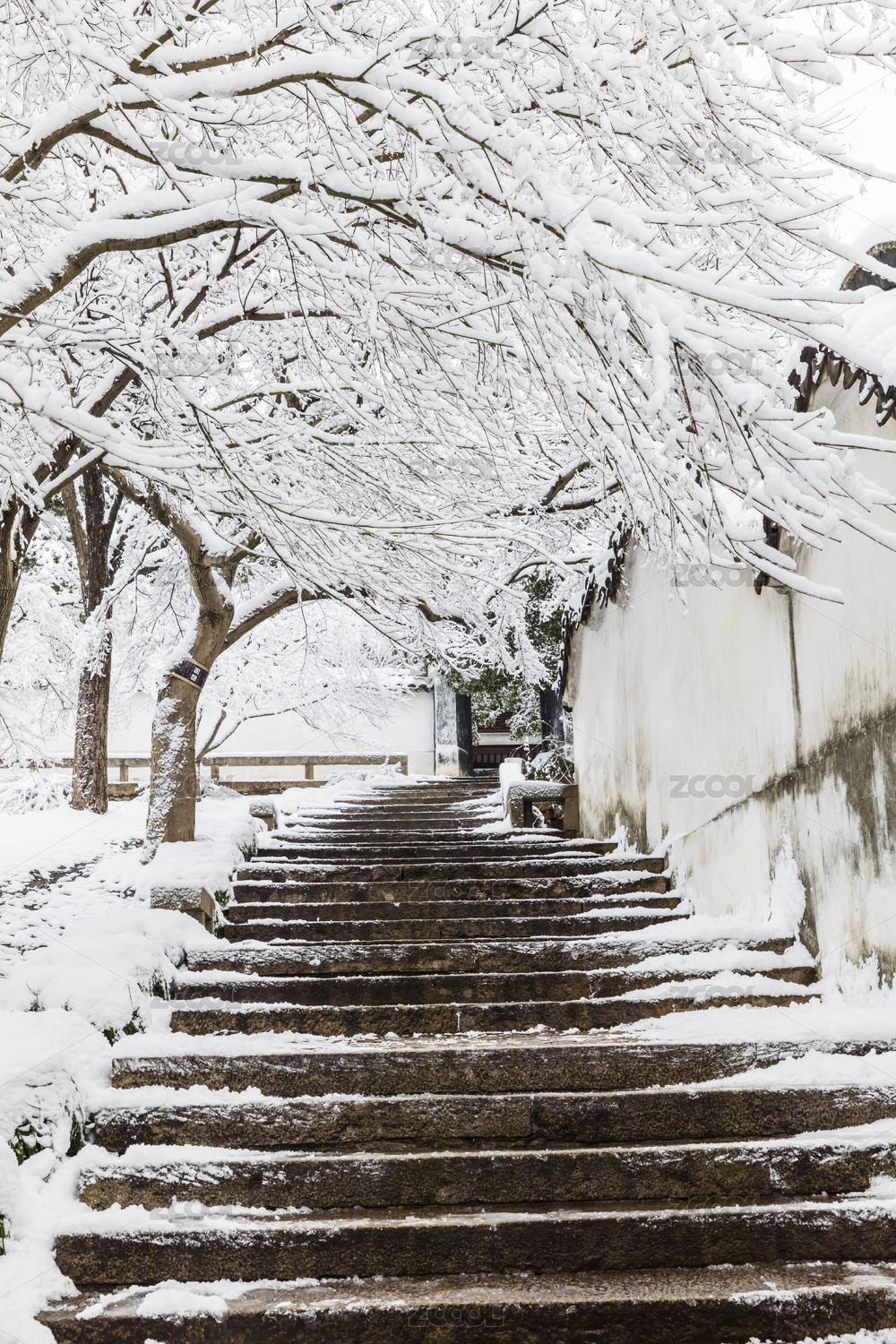 中国安徽黄山冬天下雪,白色的雪覆盖了台阶