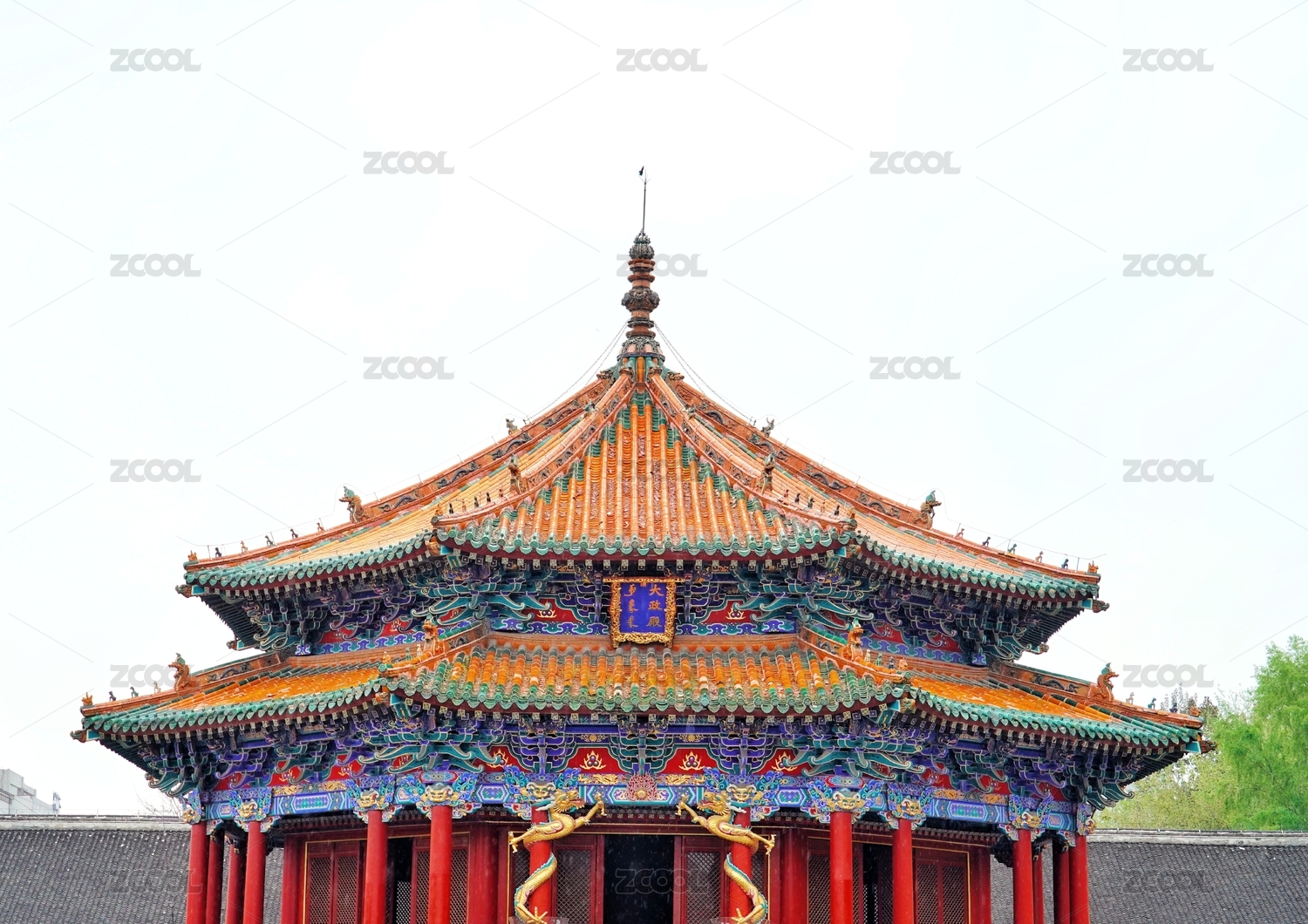 中国北京景山公园寿皇殿附属建筑碑亭—朱红色柱子琉璃瓦屋顶飞檐彩绘描金万字纹团花