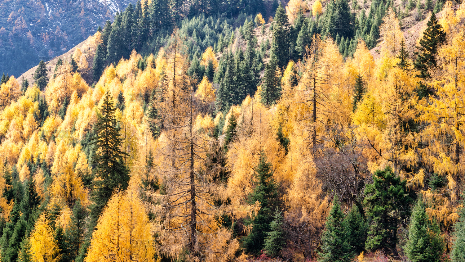 中国四川黑水县奶子沟雅克夏秋天金色的松林