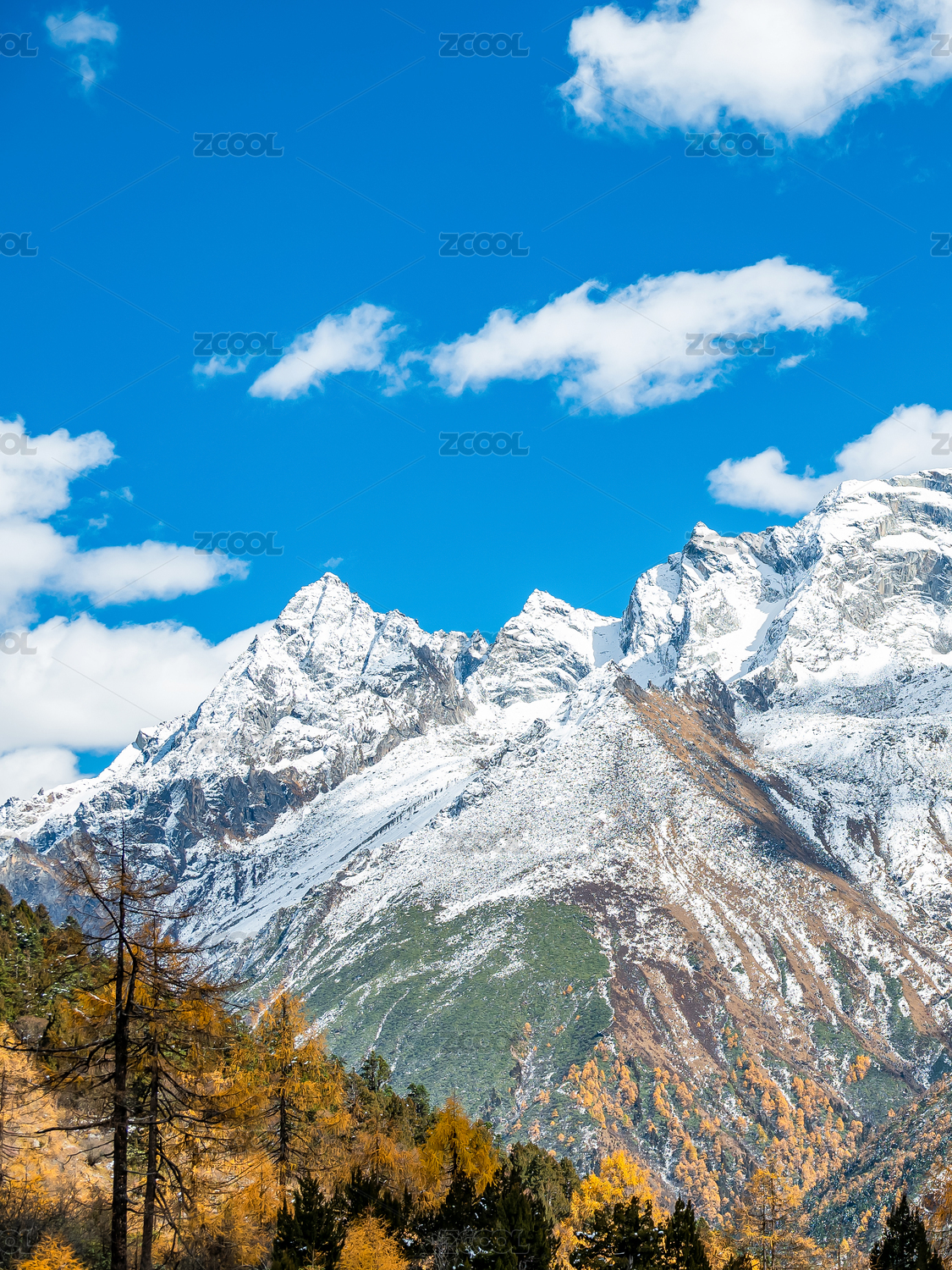 中国阿坝州毕棚沟风景区蓝天下的雪山秋林