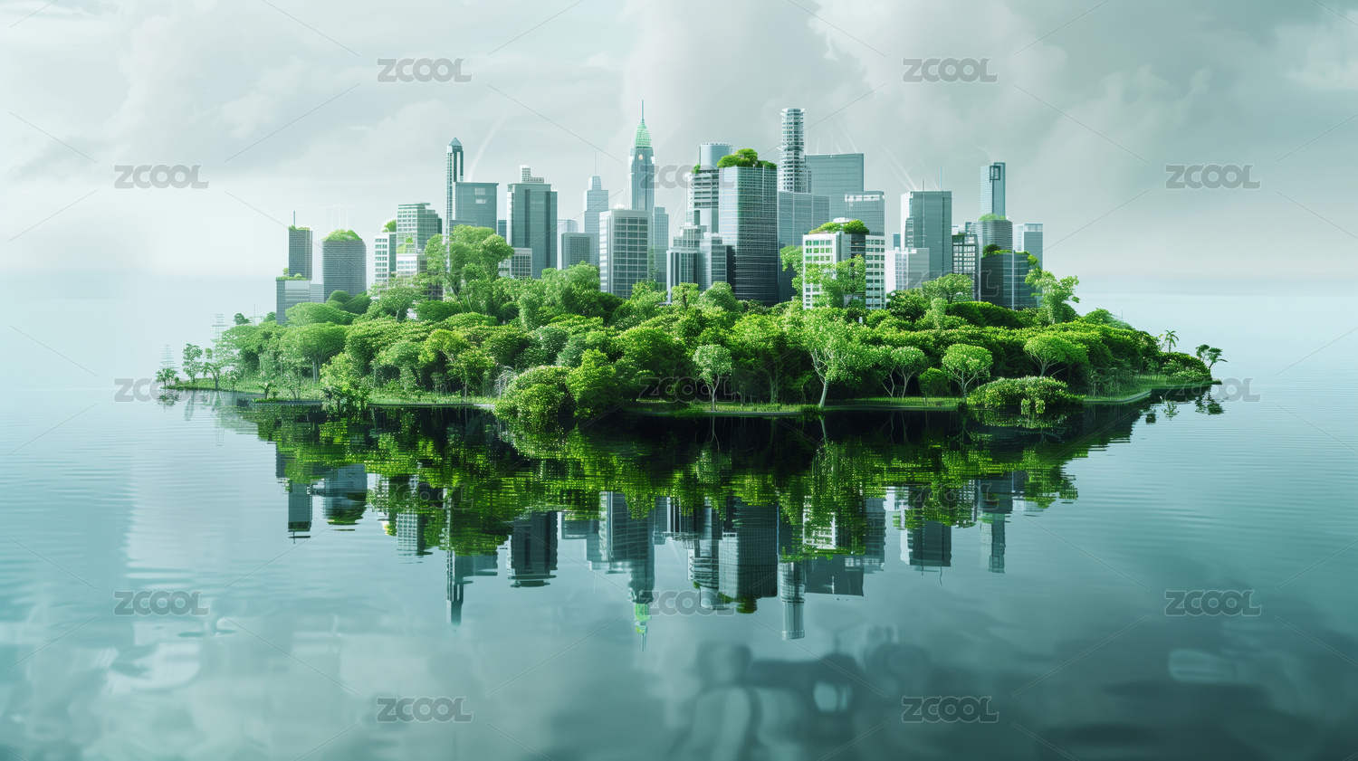 平静水面上的岛屿,有一座绿色城市