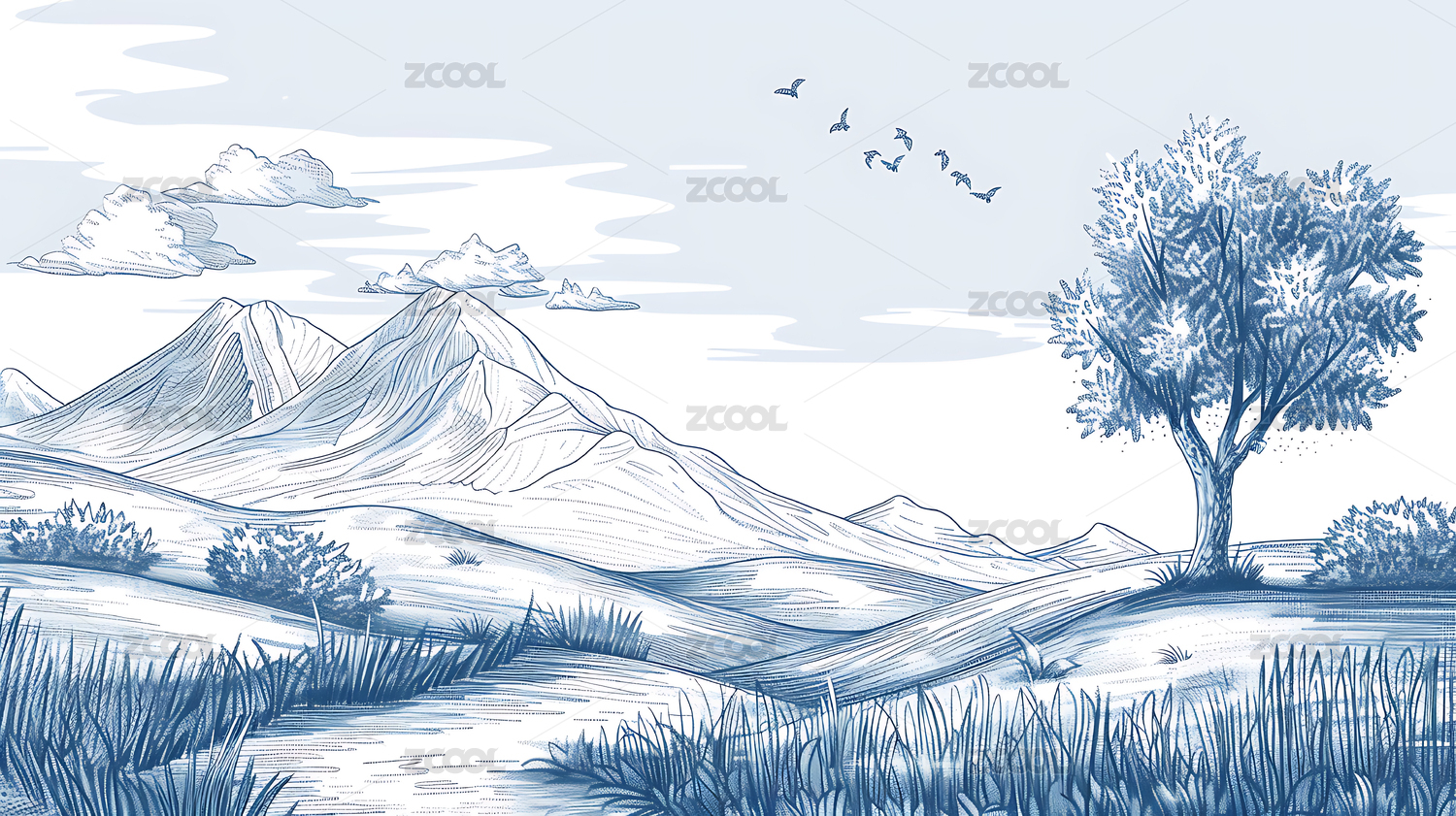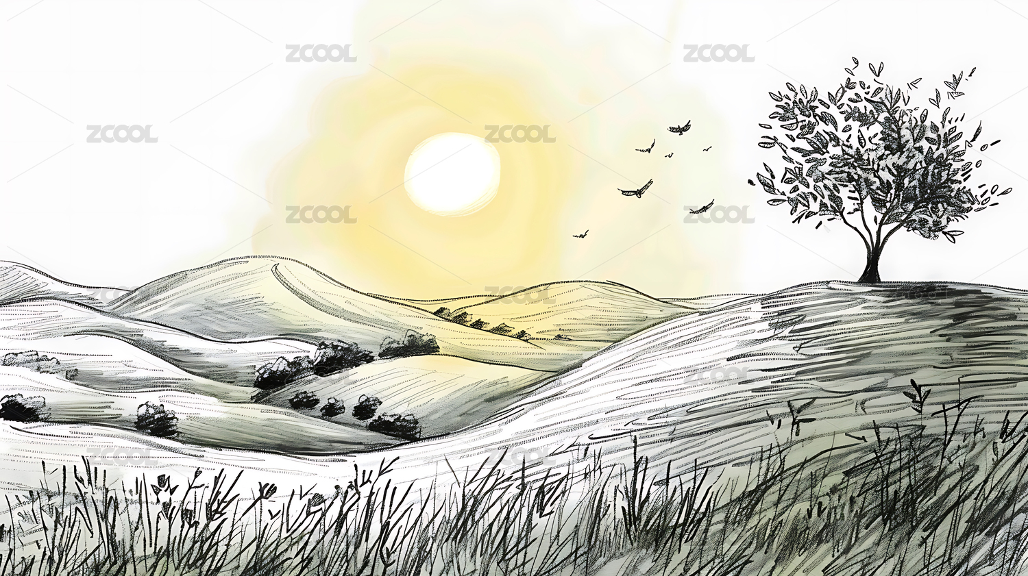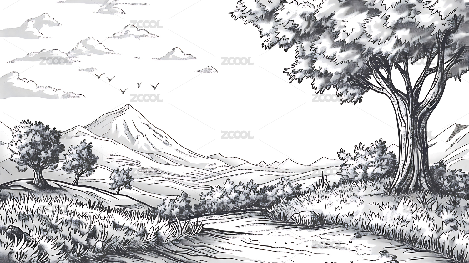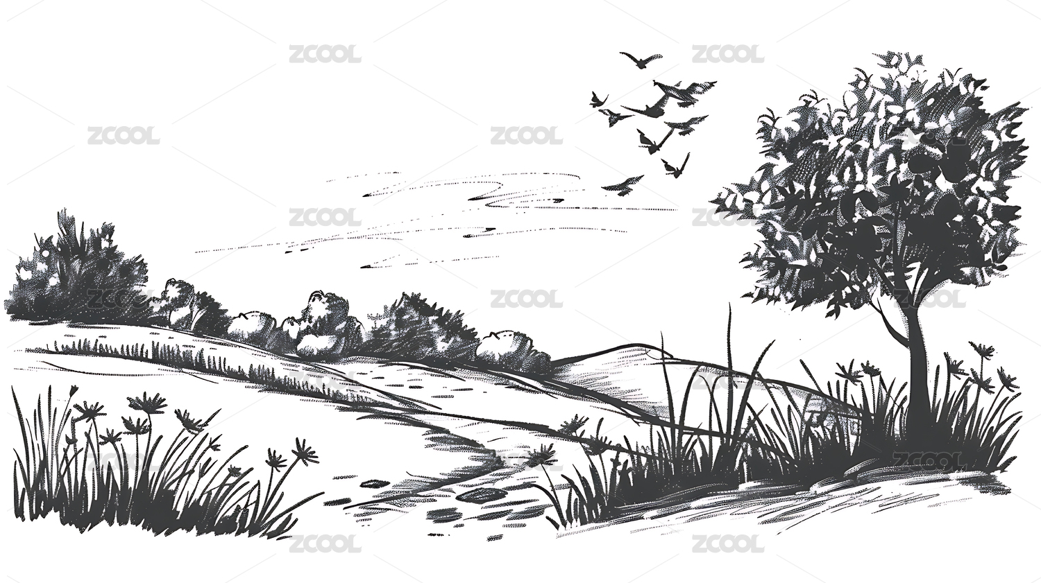 黑白风景画大树小丘飞鸟