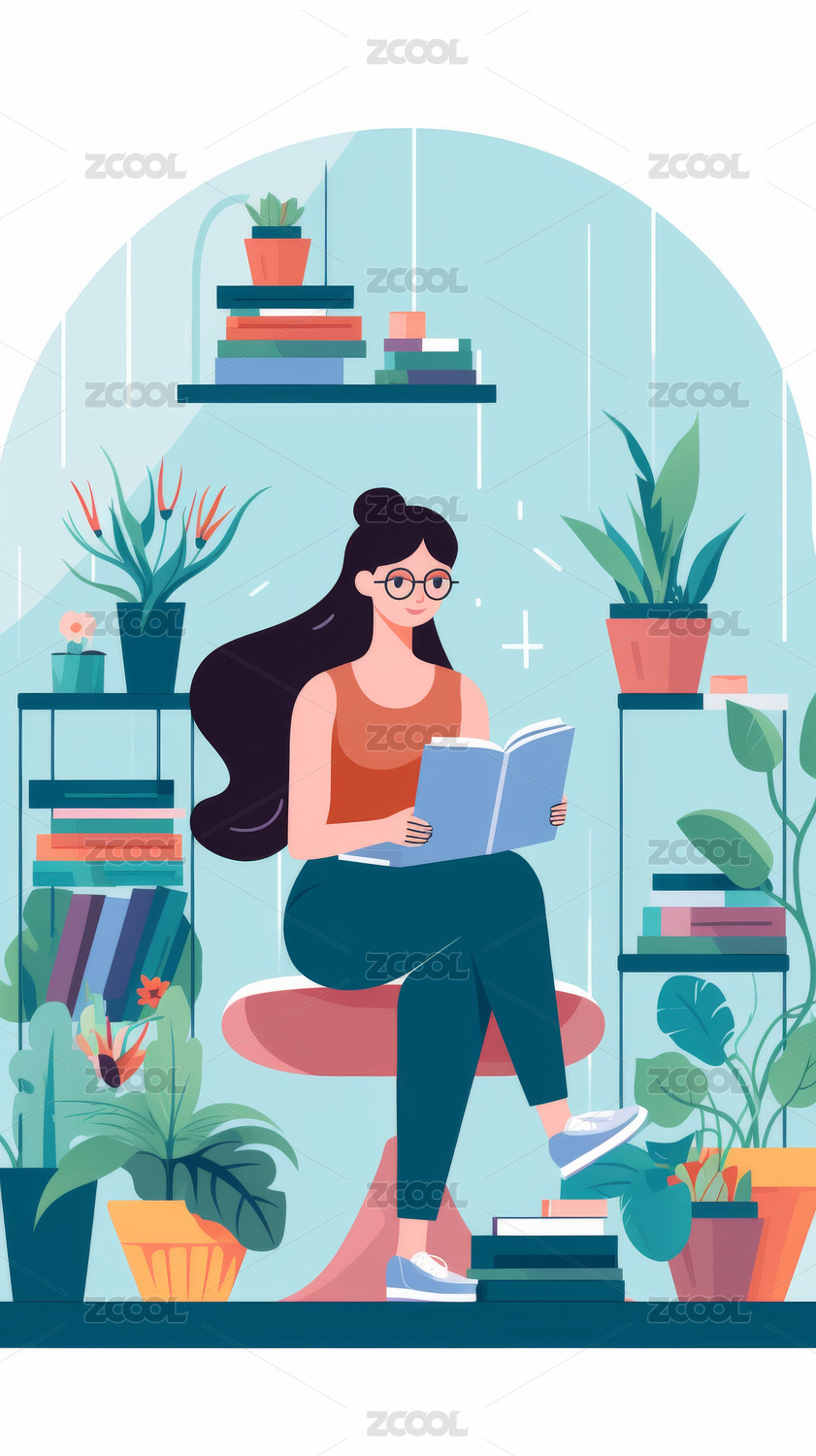 卡通手绘女子手拿笔记本喝咖啡学习工作插画