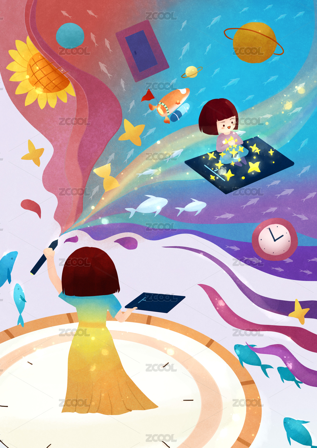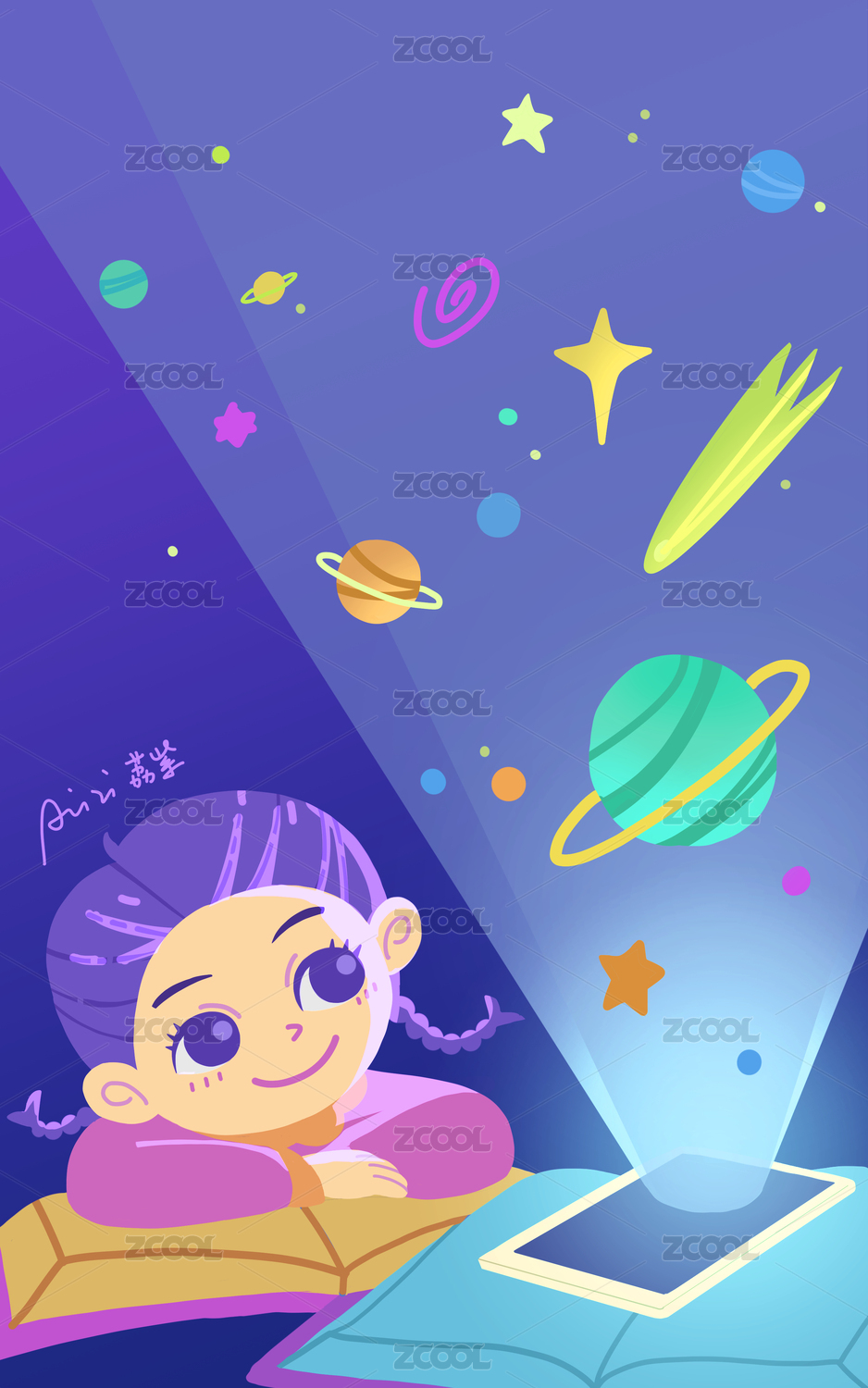 晚上小女孩和月亮坐在墙上 板绘厚涂