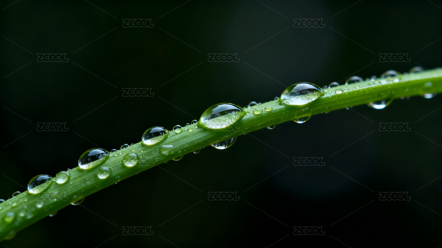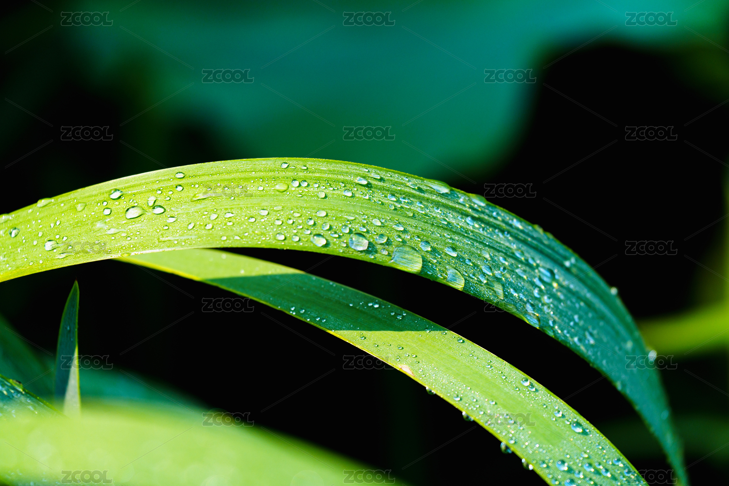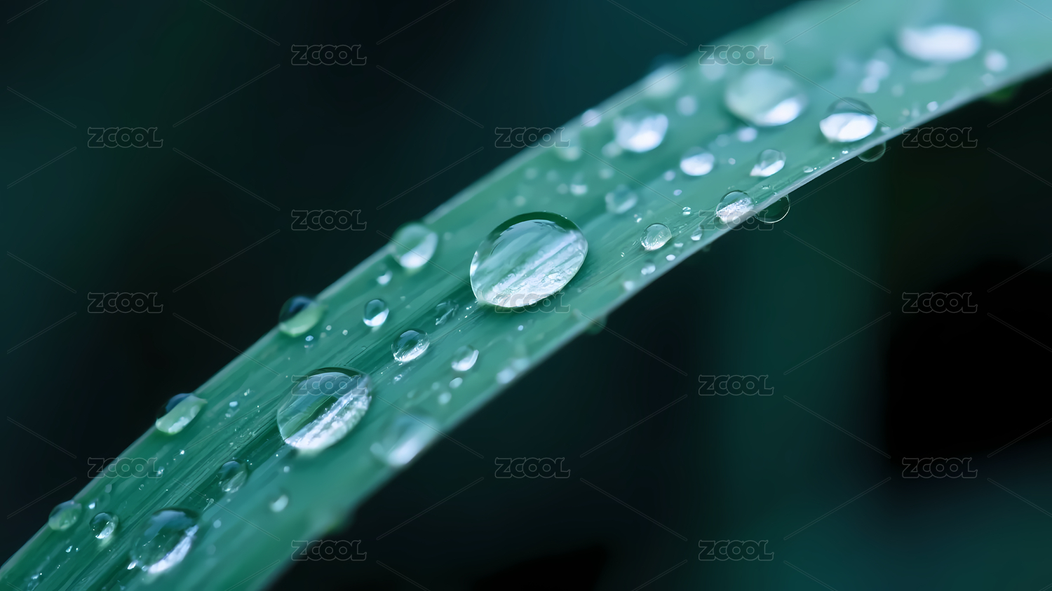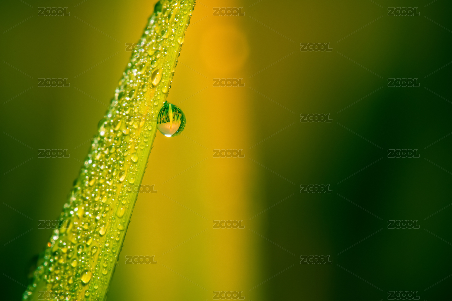 清晨阳光照射草叶上晶莹欲滴的露珠