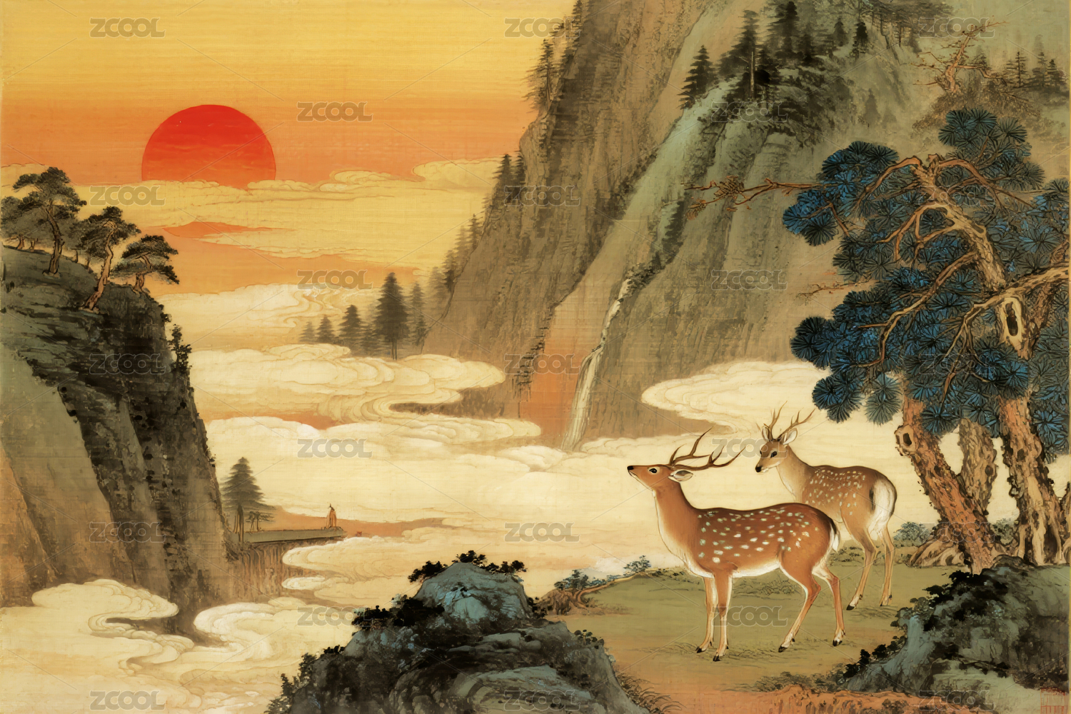 浮世绘动物两只梅花鹿冬天积雪松柏树