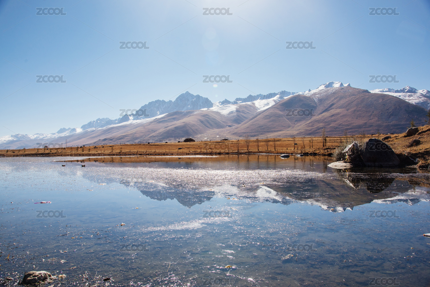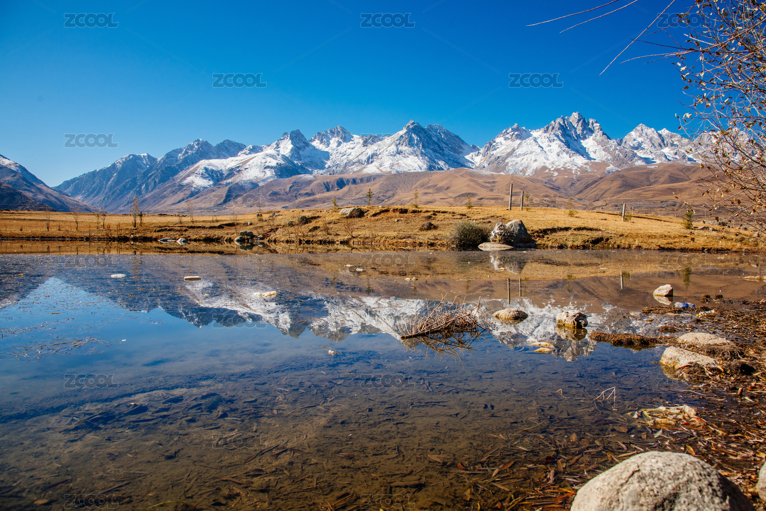 蓝色天空下,远方的雪山倒映在湖泊之中