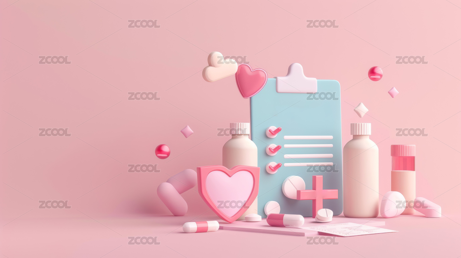 卡通医药医疗爱心与药瓶3D渲染