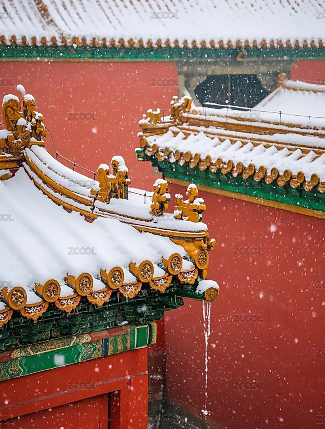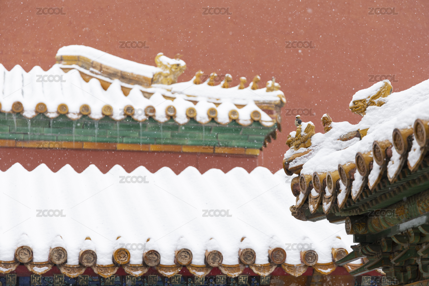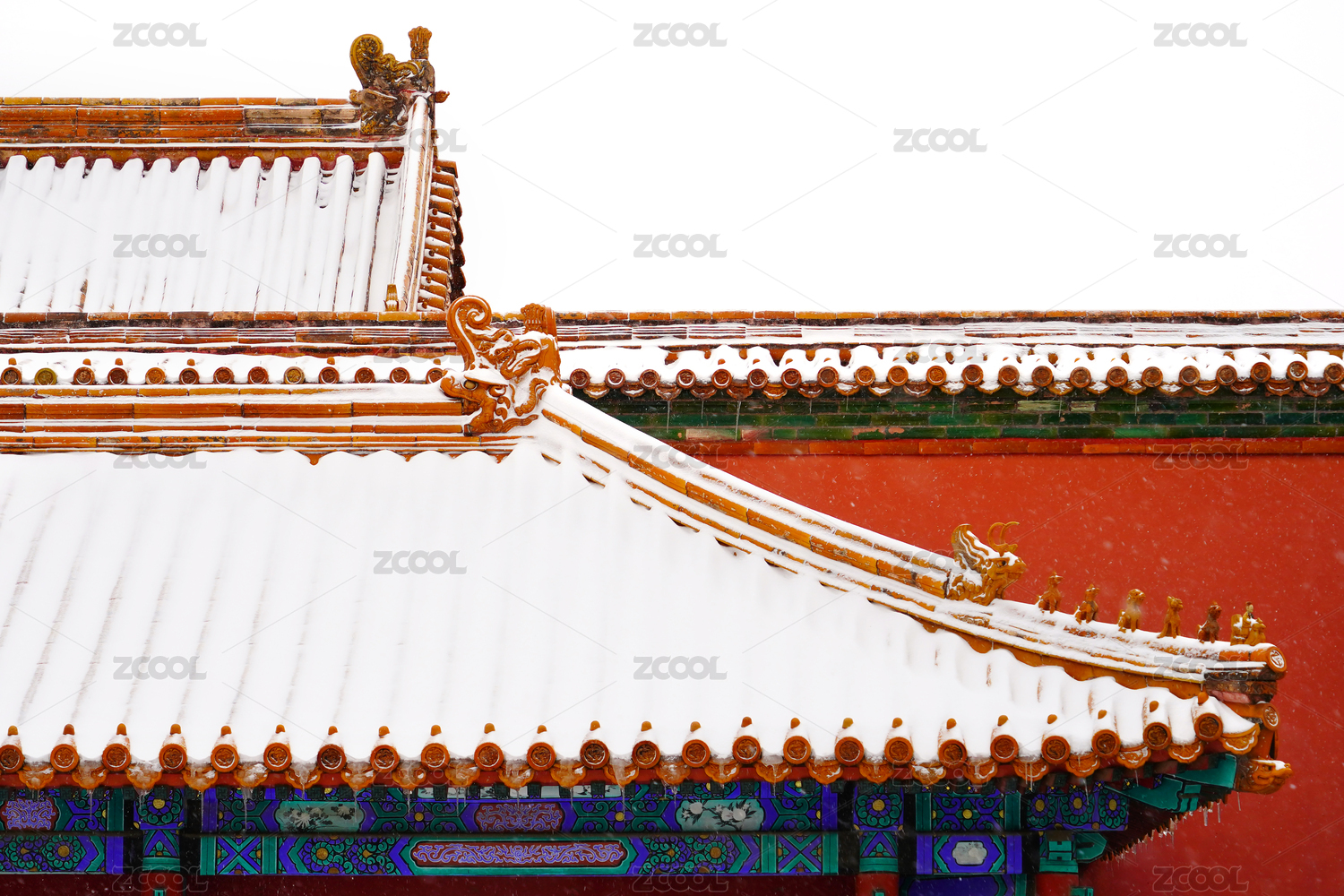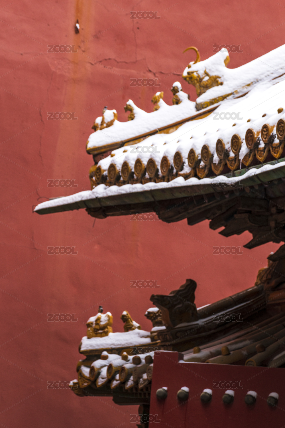 北京故宫冬季白雪覆盖的房檐脊兽和红墙