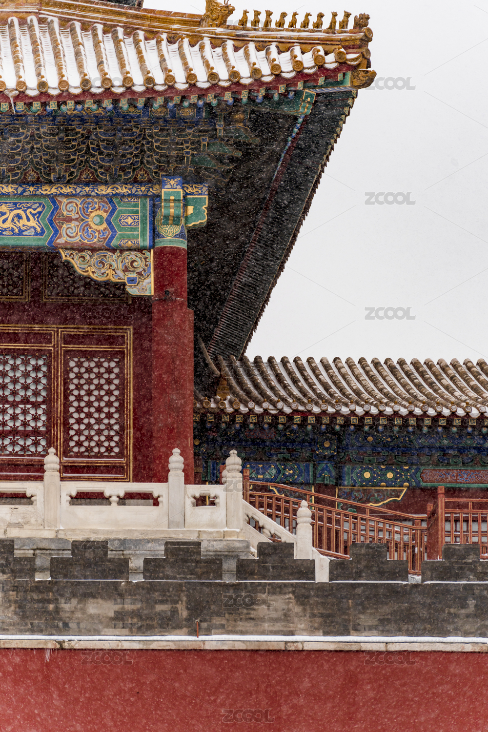 雪后中国北京故宫宫殿屋脊特写