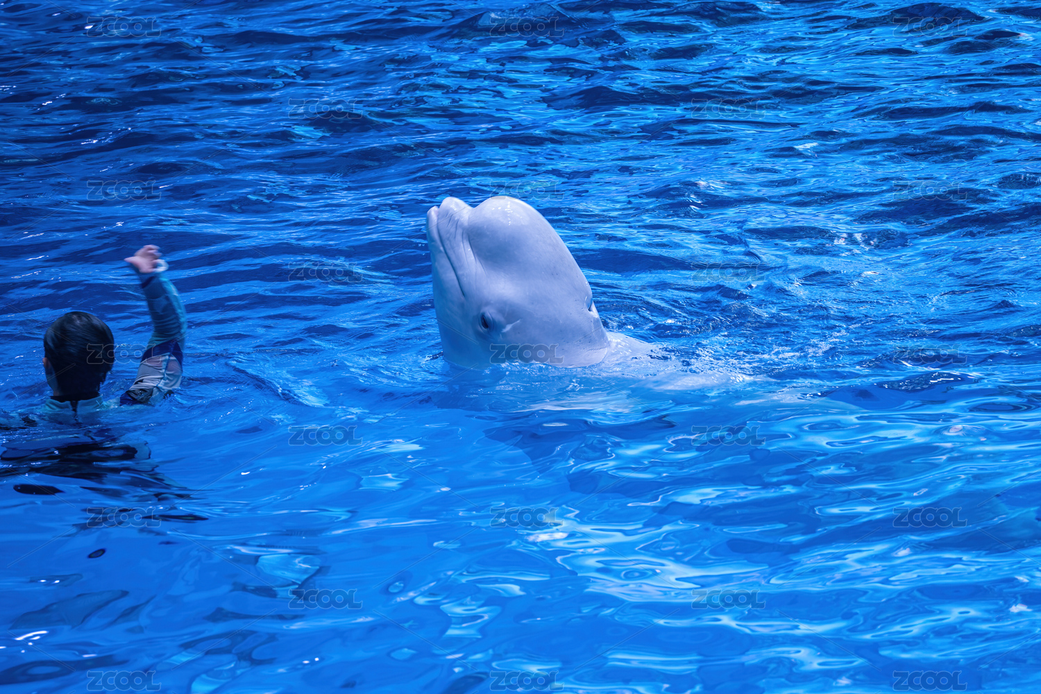四川成都极地海洋公园里正在表扬节目的白鲸
