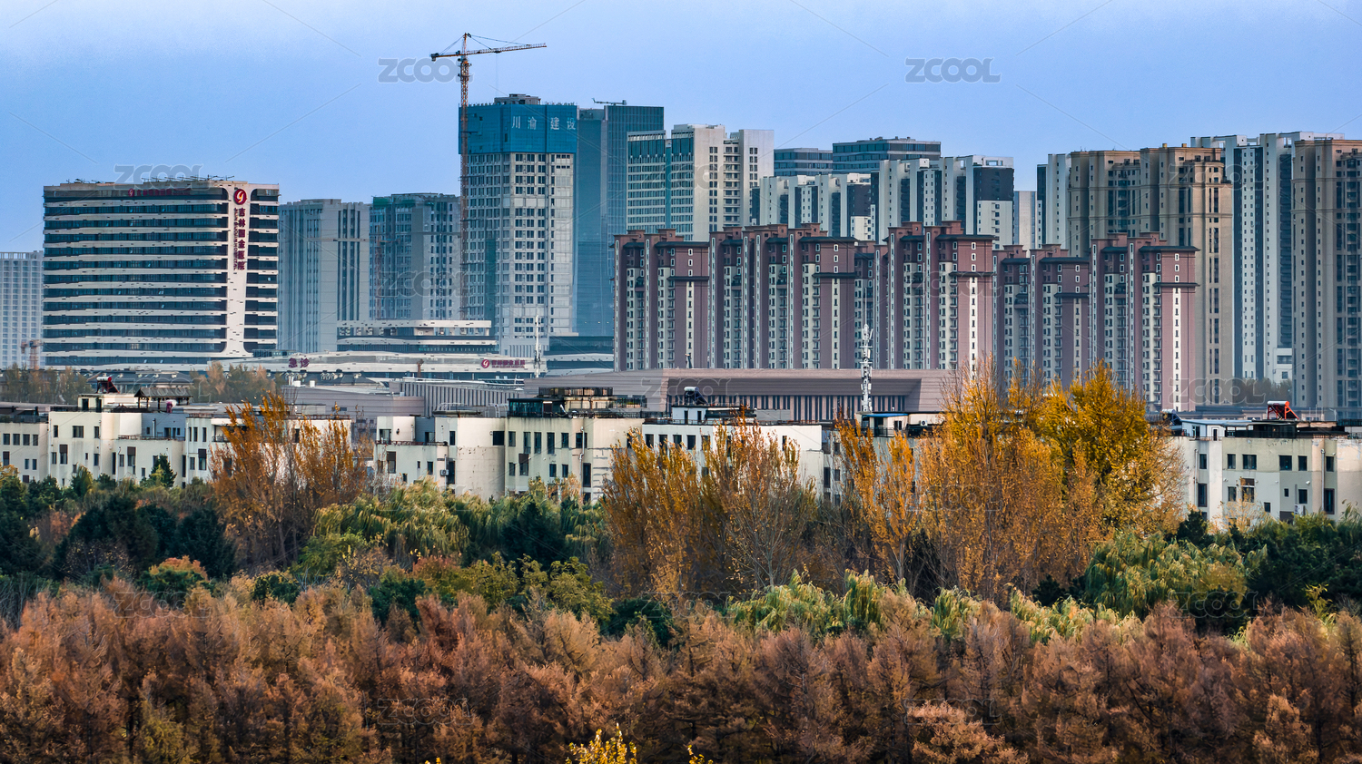 中国新疆乌鲁木齐傍晚时分的摩天大楼群