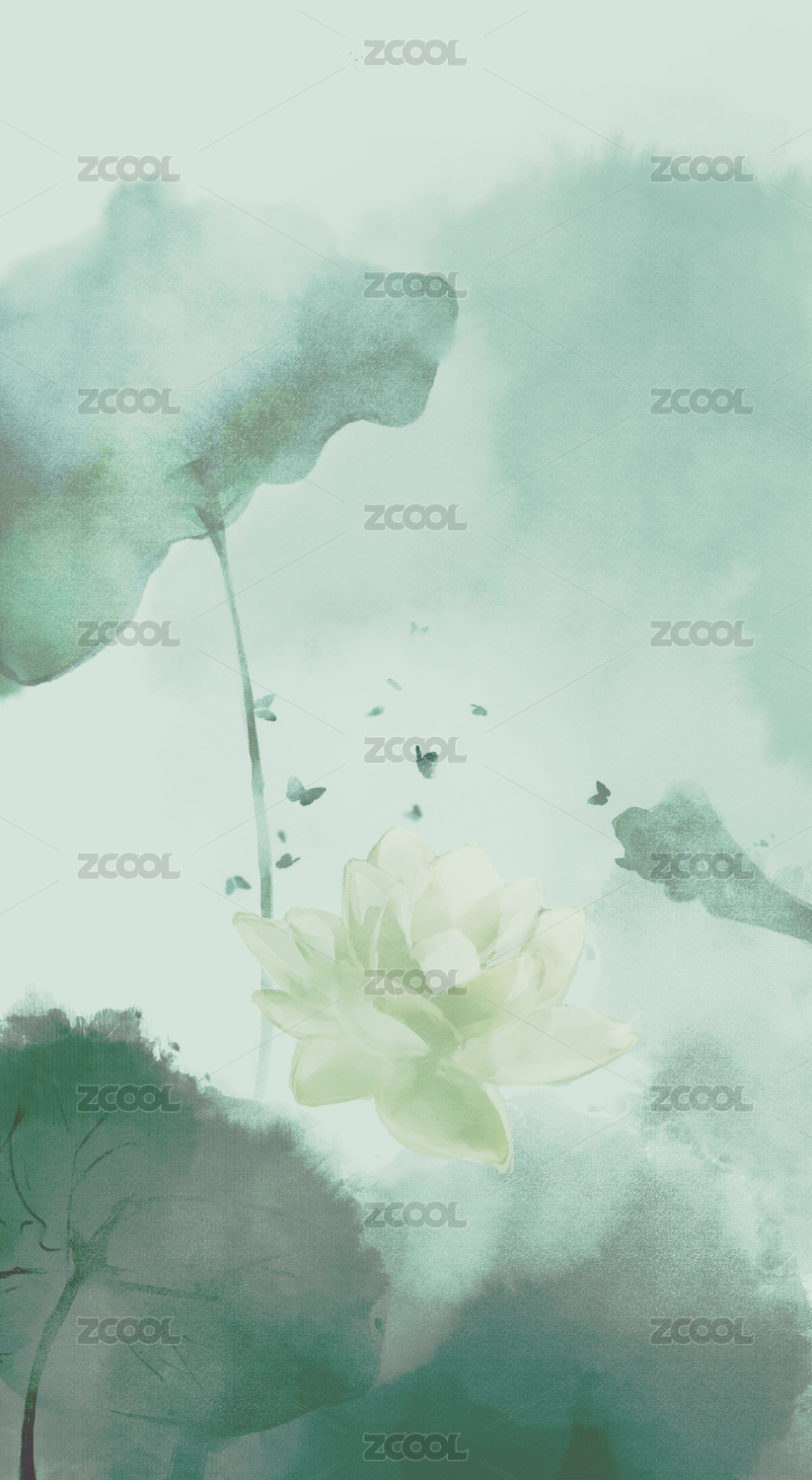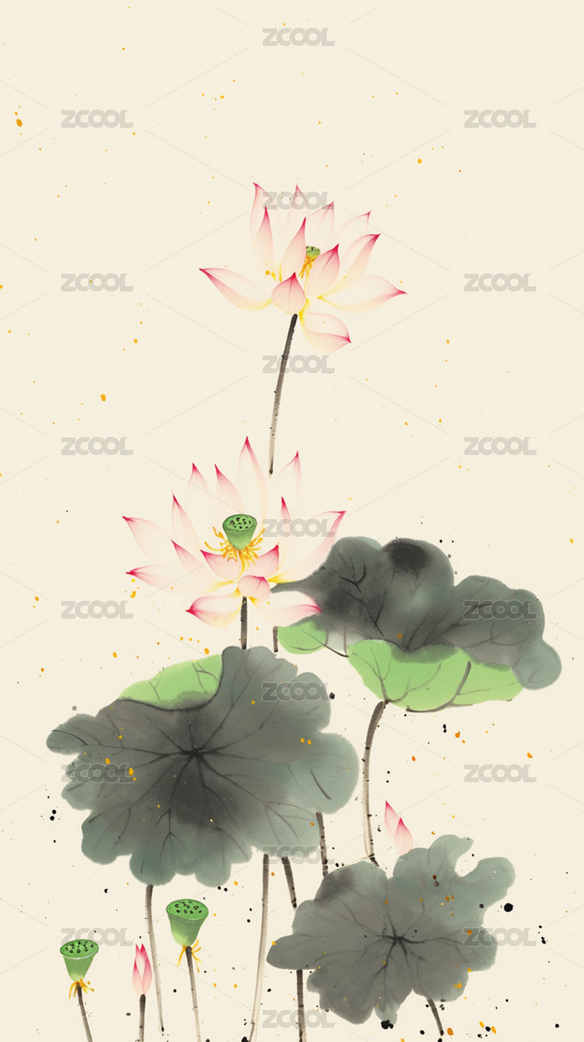 中国风水彩淡墨质感莲花荷花荷叶组合插画