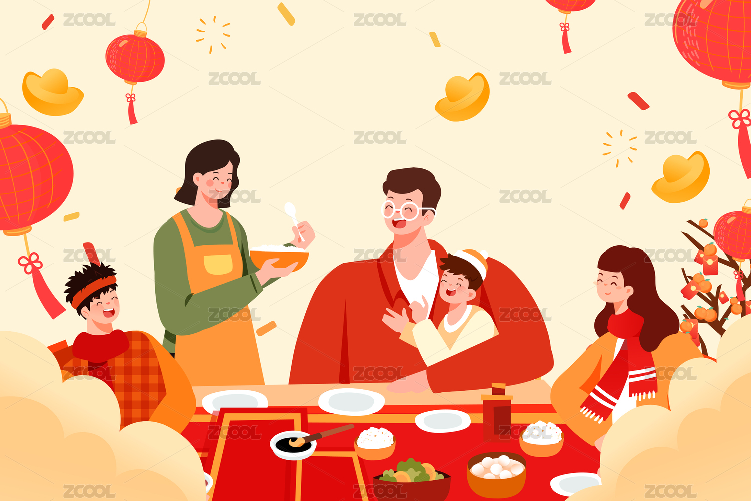 除夕年夜饭一家人团圆插画庆祝春节活动海报