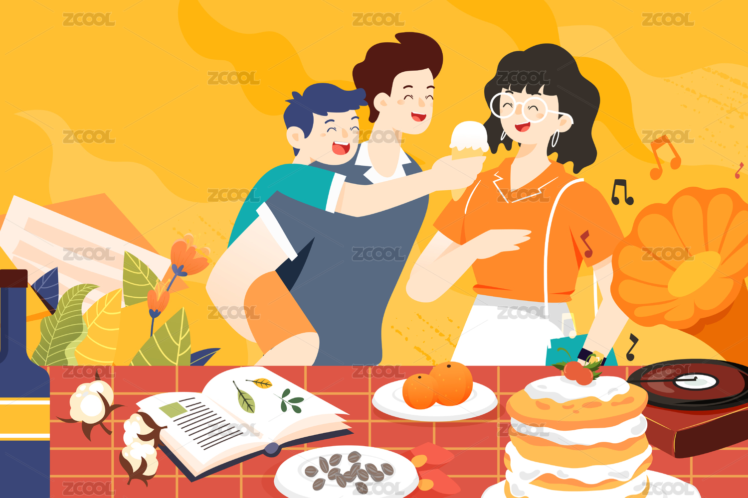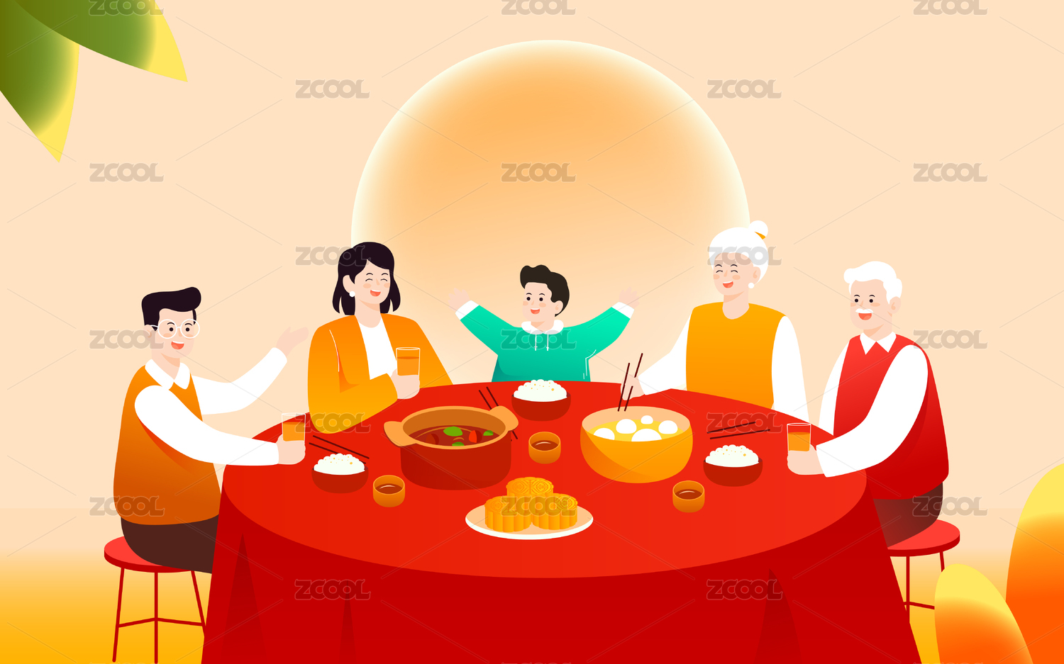 中秋节家人团圆朋友吃饭聚餐美食促销插画