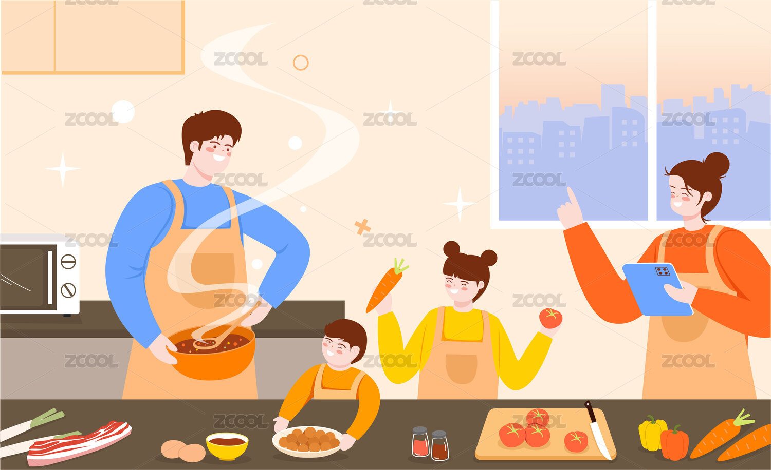 卡通新年春节年夜饭团圆饭吃饭家人团圆背景矢量插画