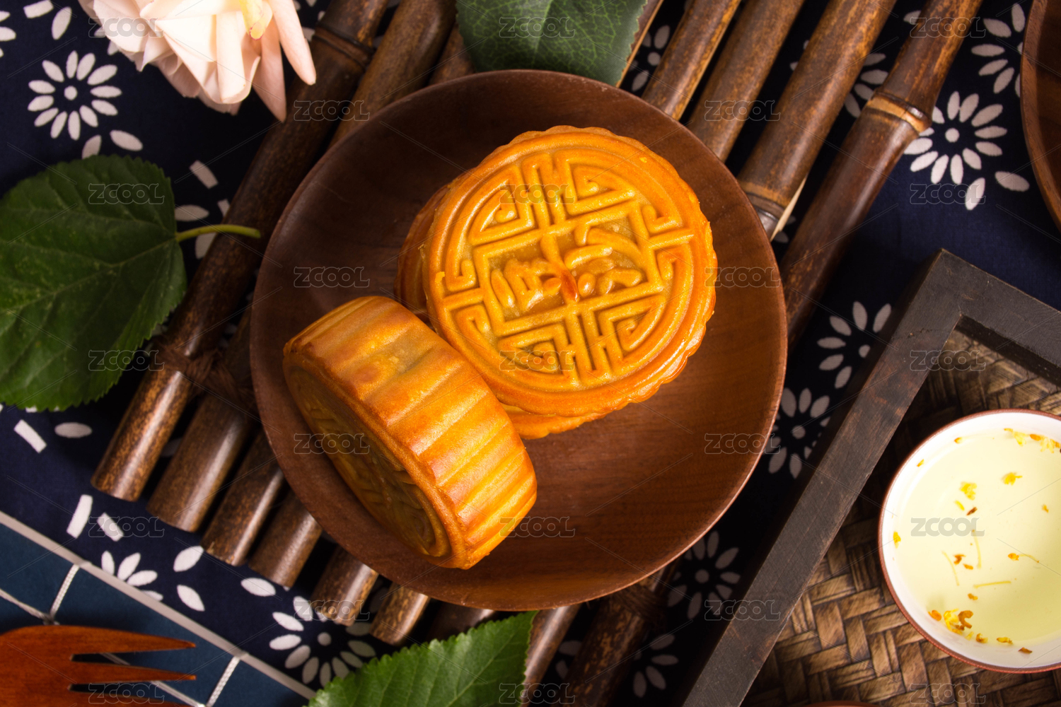 中式圆木纹桌子上的月饼