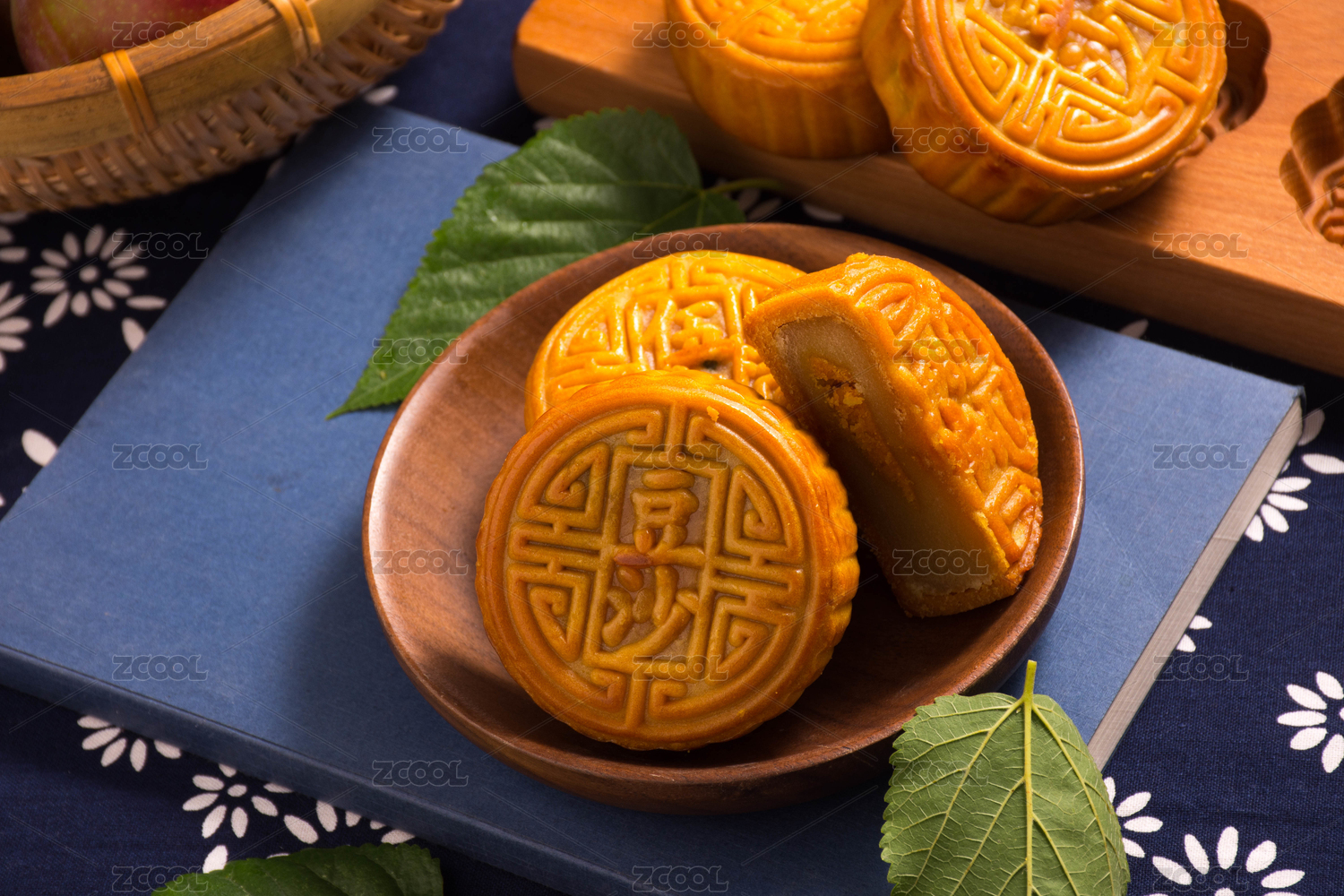 中国风青花背景月饼组合,中秋节月饼美食