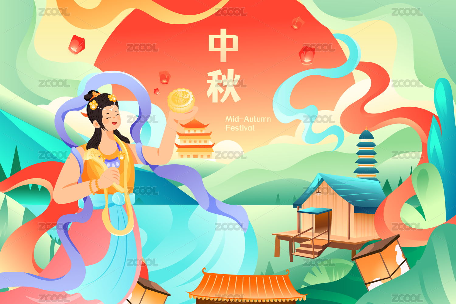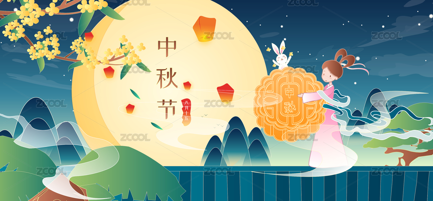 中秋节嫦娥月亮宫殿花灯桂花祥云山牡丹花国潮插画