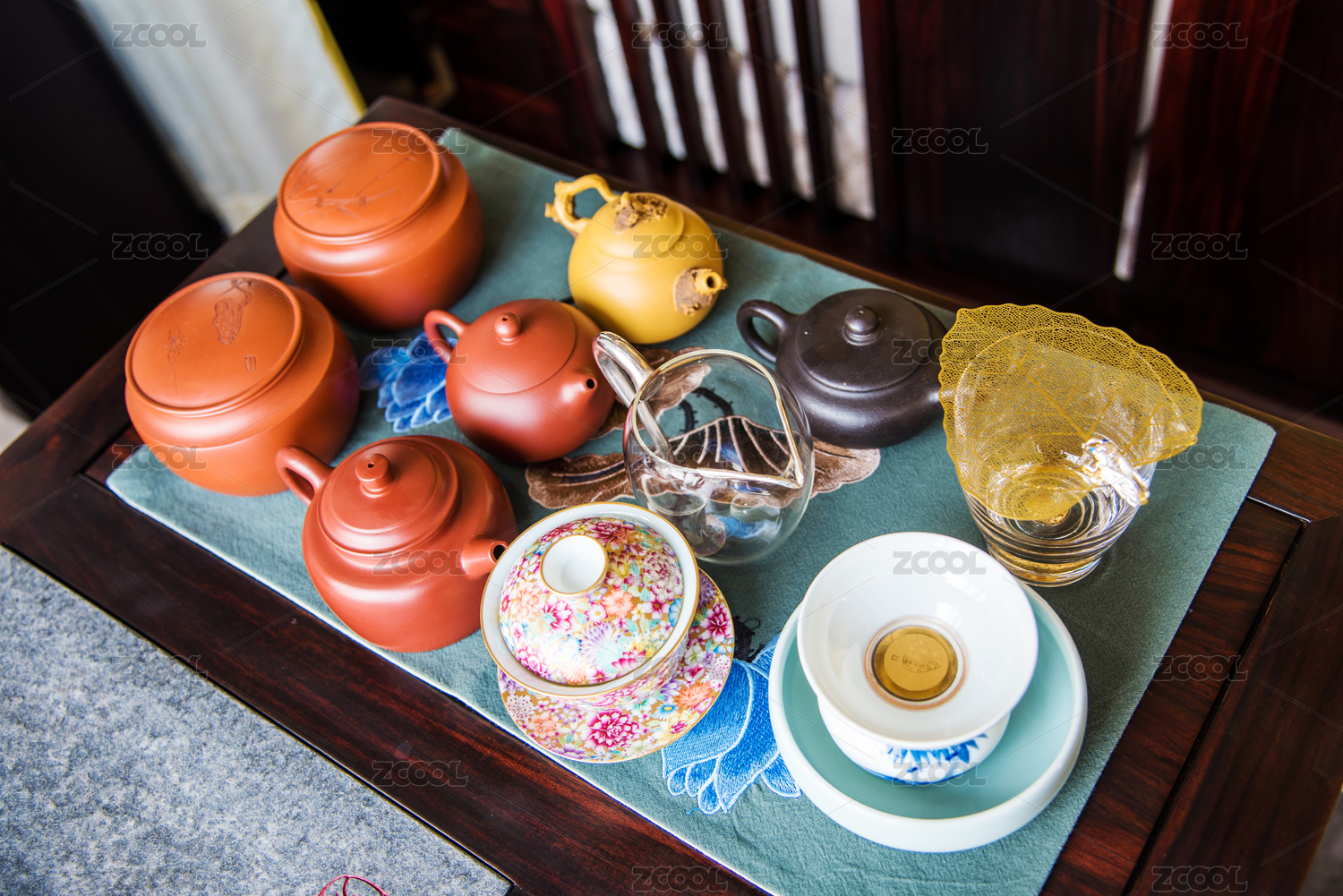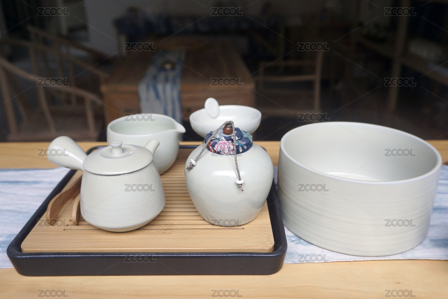 摆放在茶桌上的一套漂亮的瓷器茶具