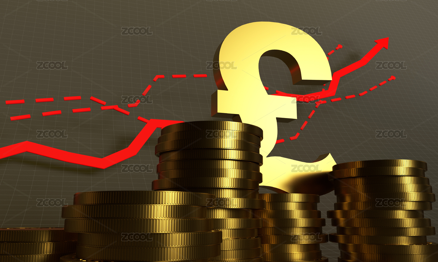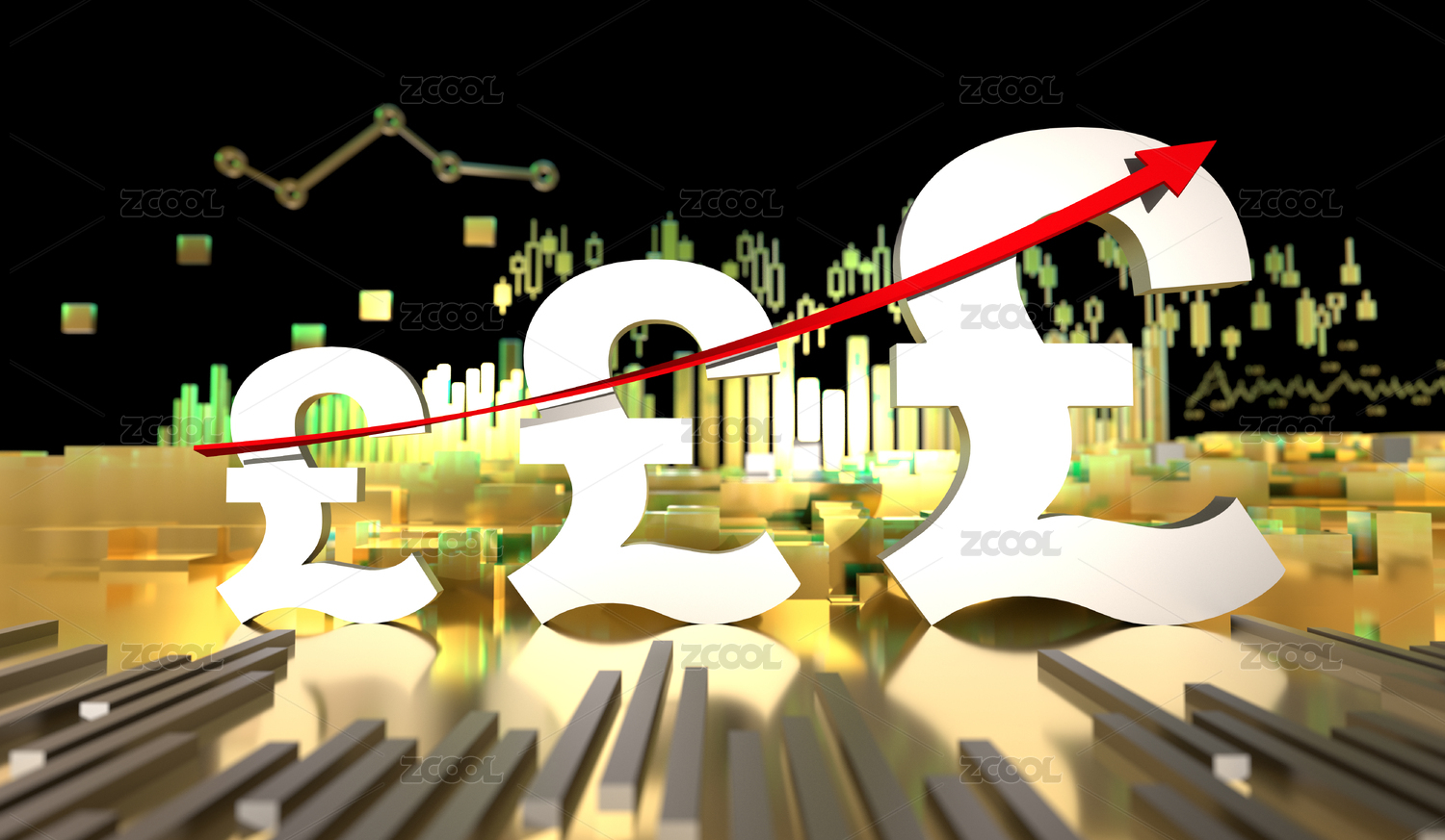 英镑货币符号组成的成功箭头与数据图表,代表了经济的增长与货币升值