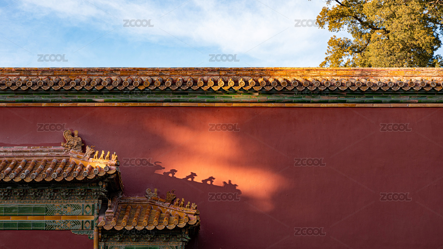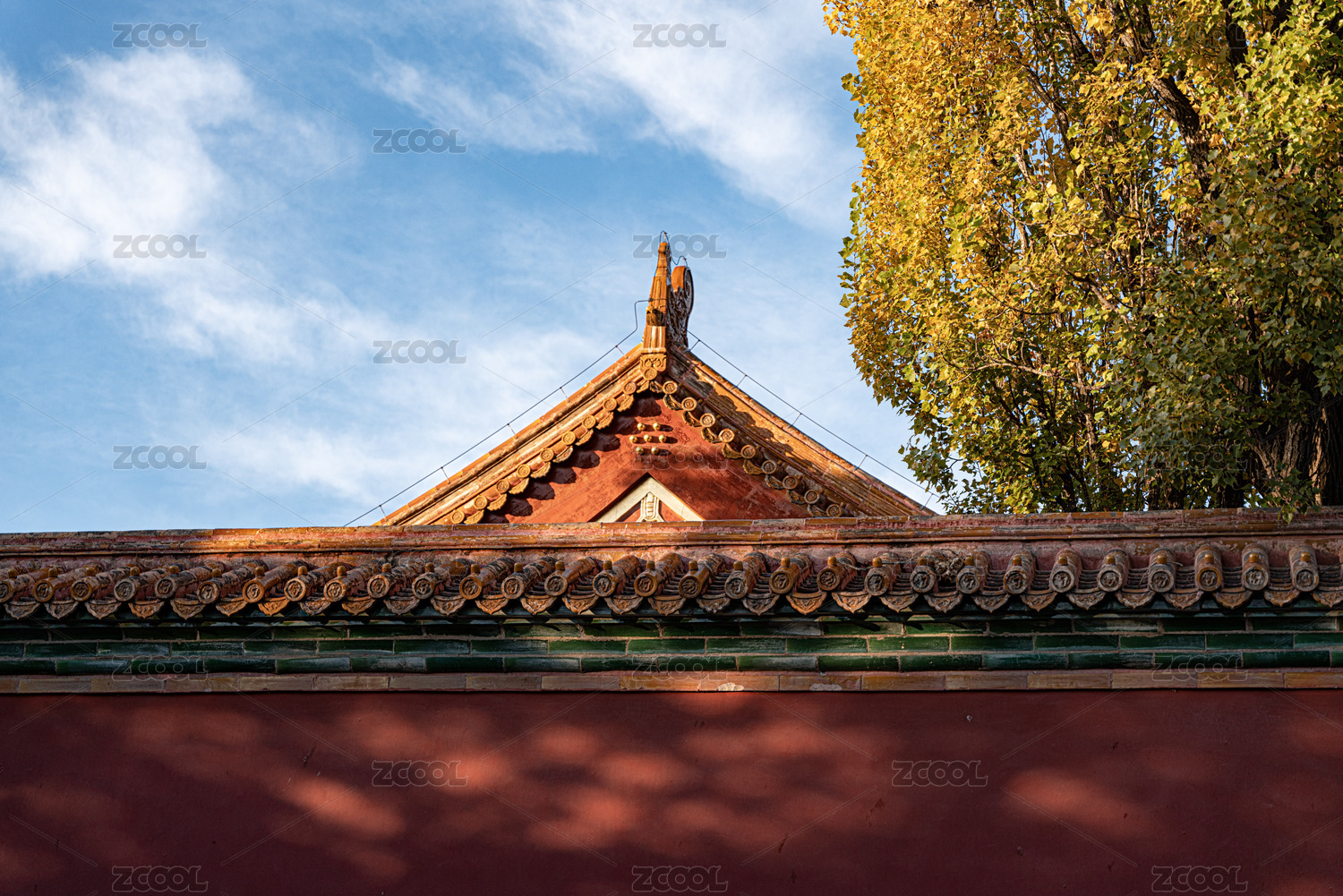 北京故宫博物院红墙绿瓦和前景的绿色树叶