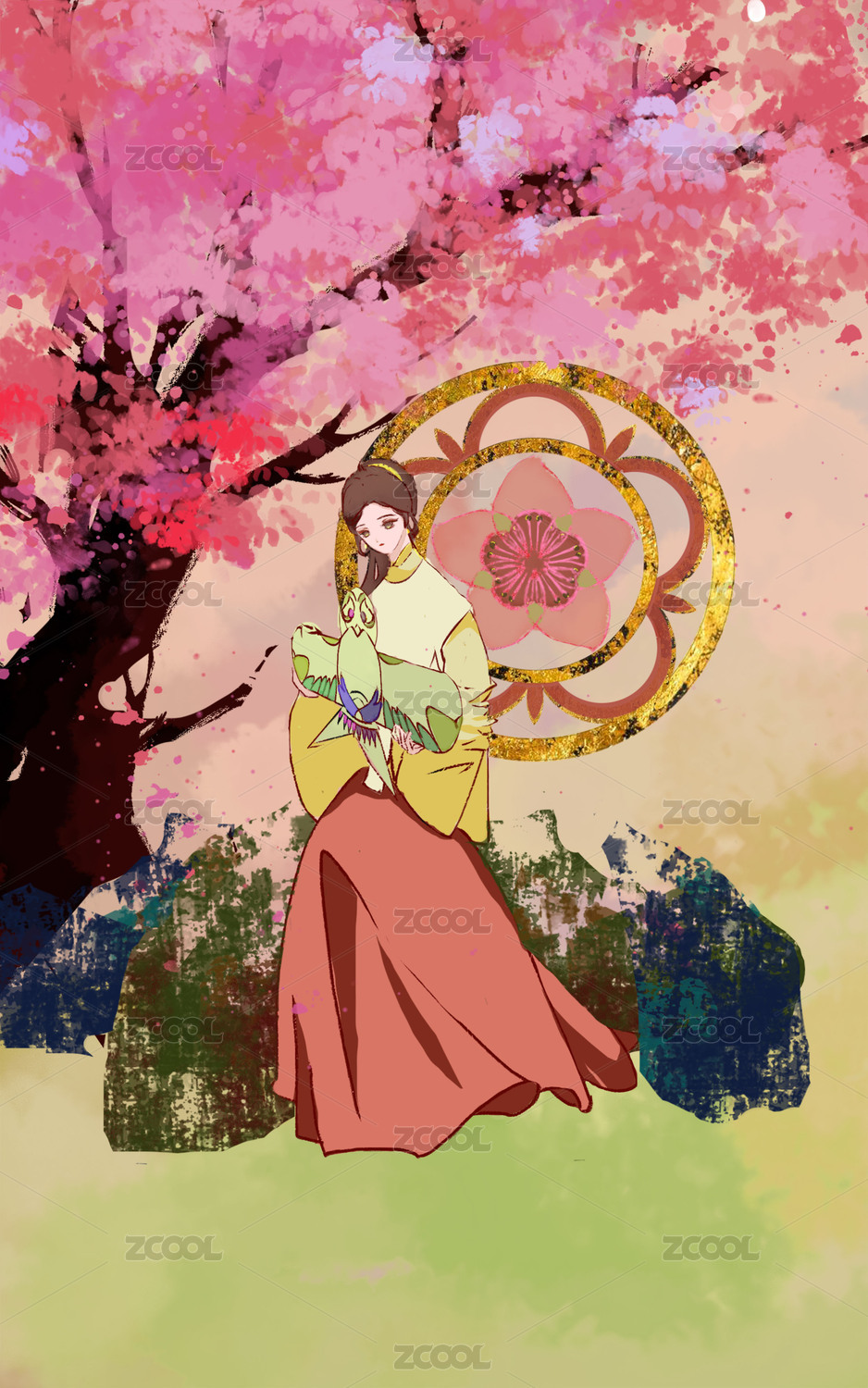 竖版国风传统美女桃花花神树下风筝唯美插画