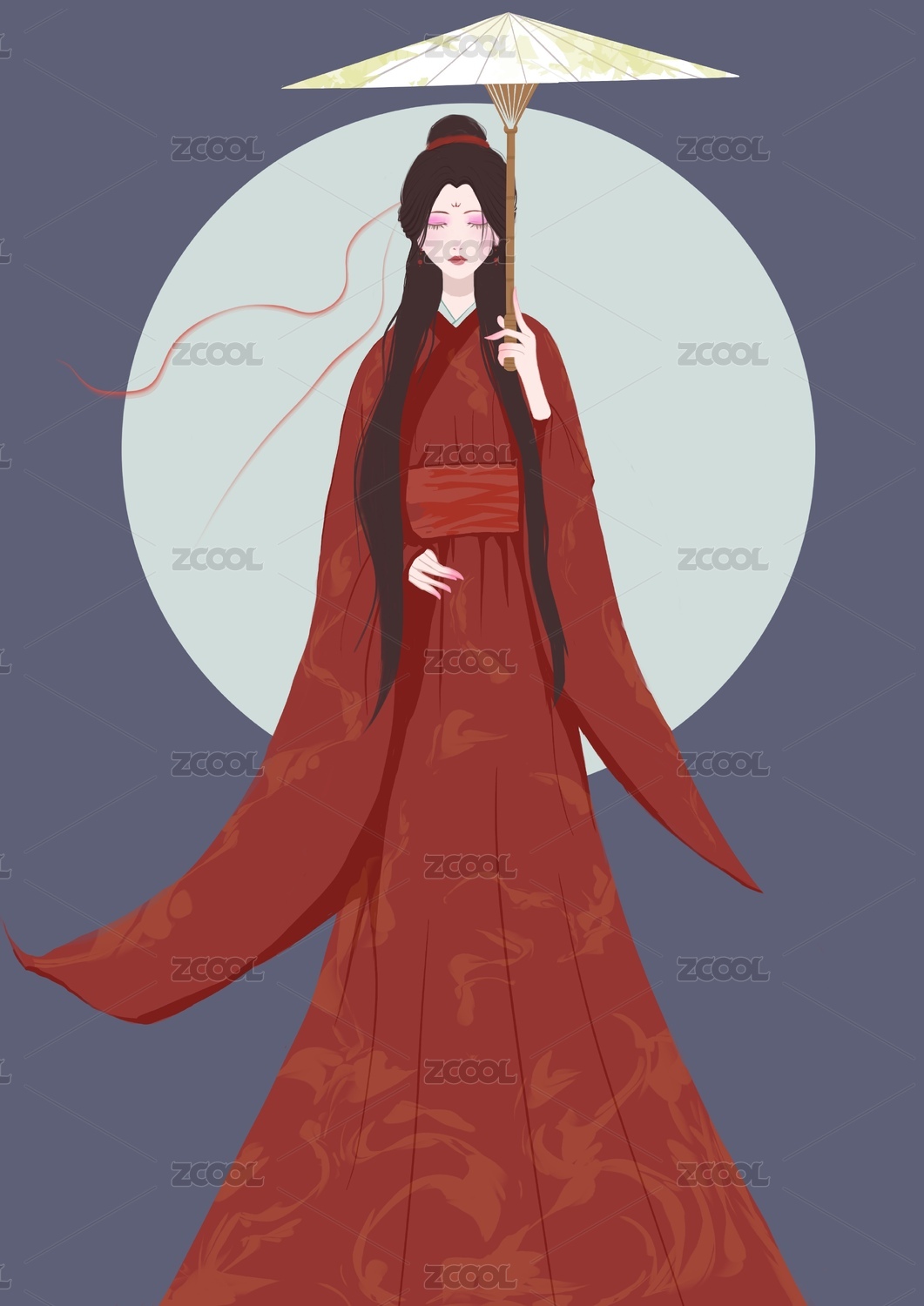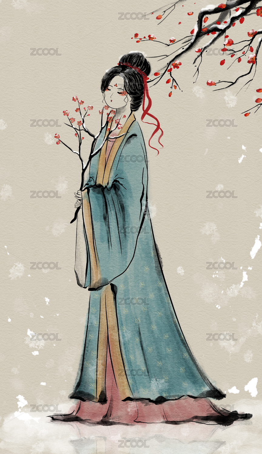 竖版国风传统美女梅花神红色斗篷唯美插画