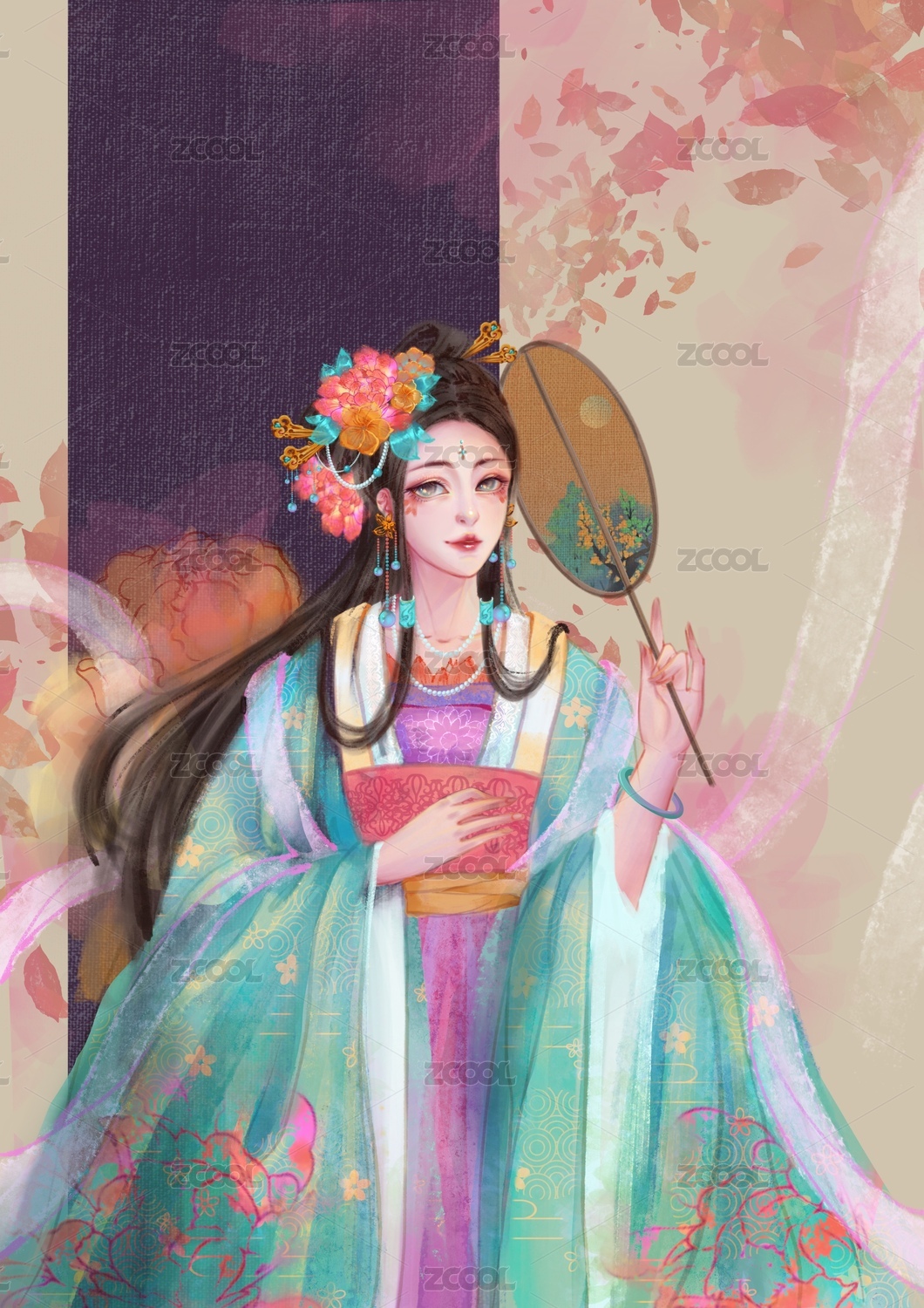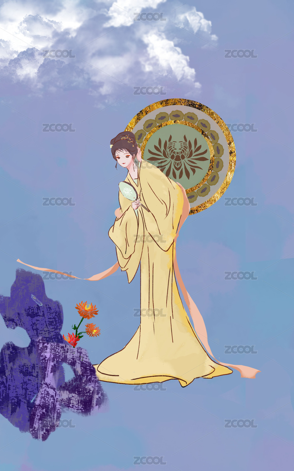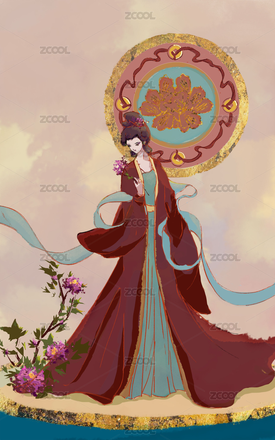 竖版国风传统美女牡丹花神夕阳唯美插画