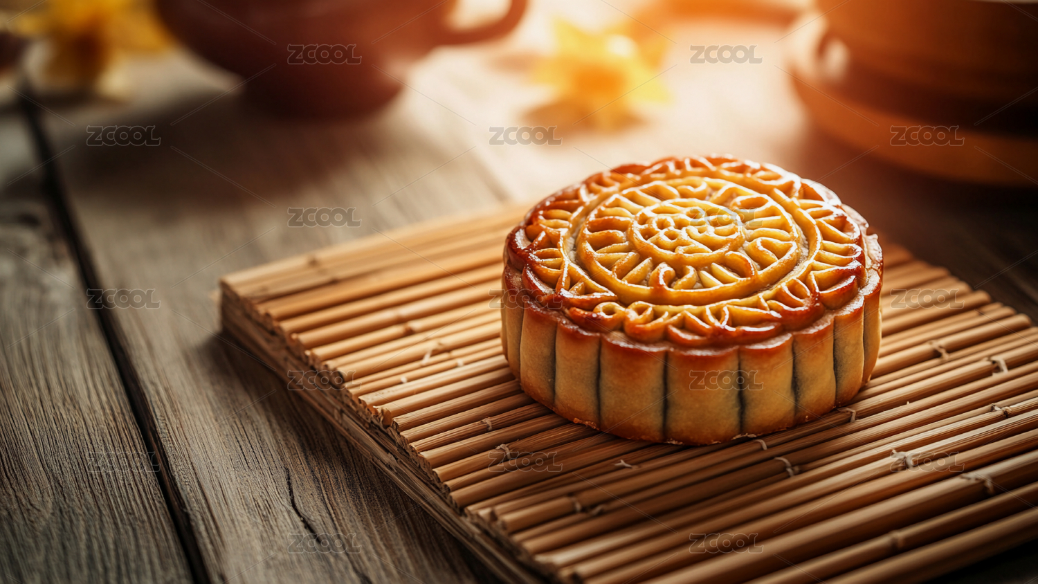 中式复古环境中烘烤金黄的月饼摆放在桌面