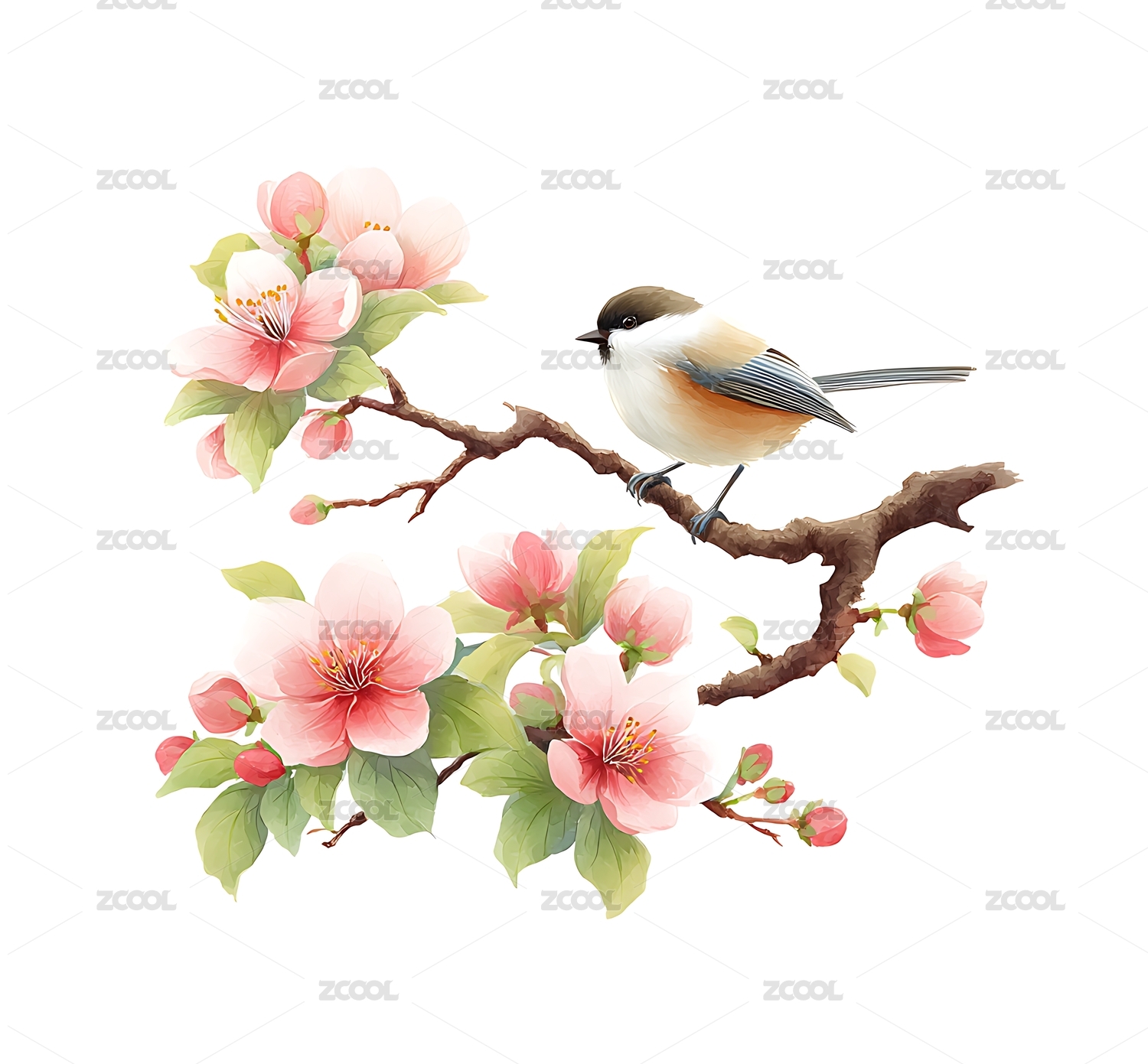 飞鸟,樱花,树枝,花朵,粉色,水彩画,绘画,艺术,自然,春天