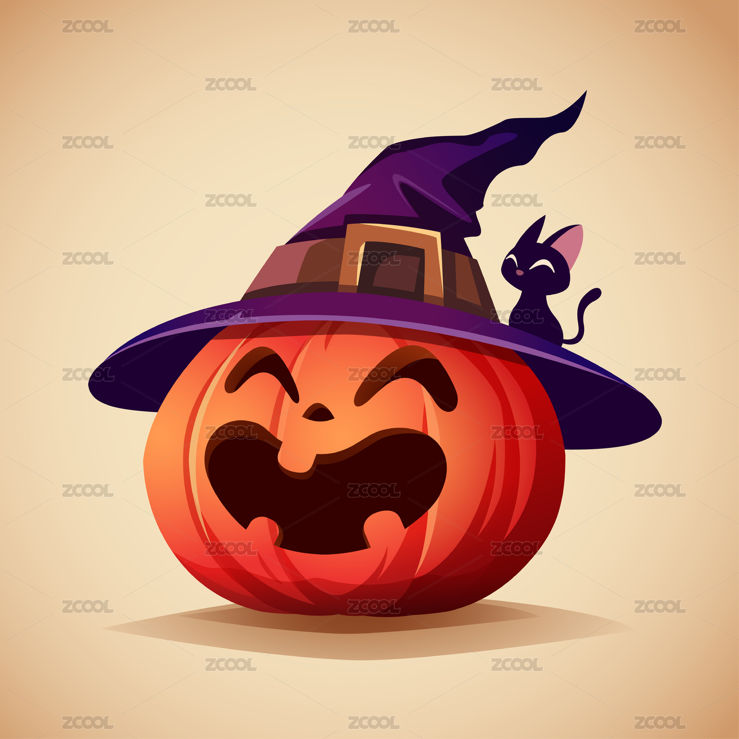 橙色卡通和蝙蝠戴魔术帽的南瓜元素