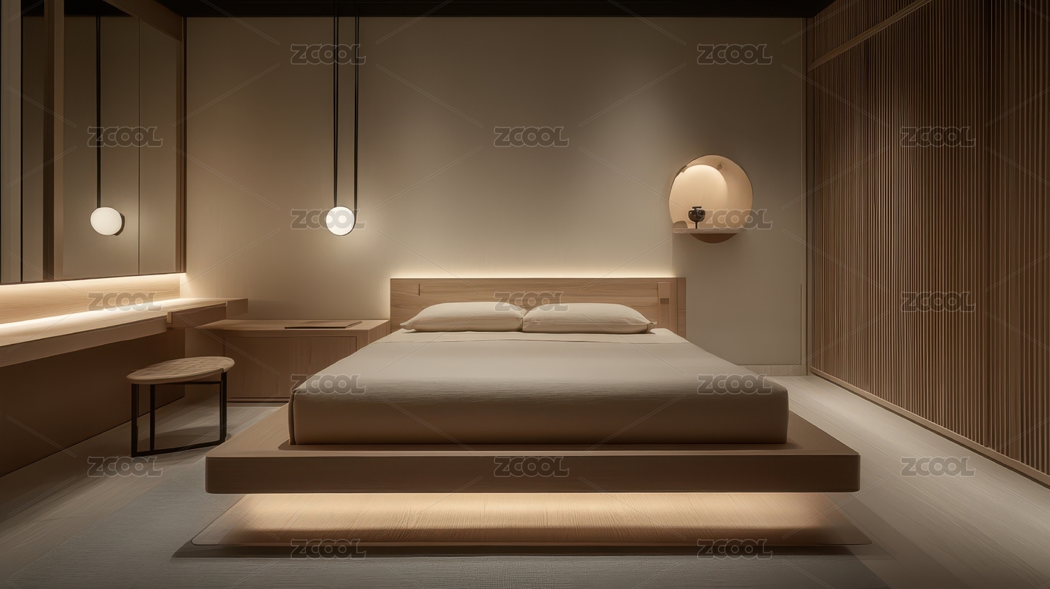 现代, 室内设计, 自然光, 植物, 平静, 室内,卧室, 床, 床单, 舒适