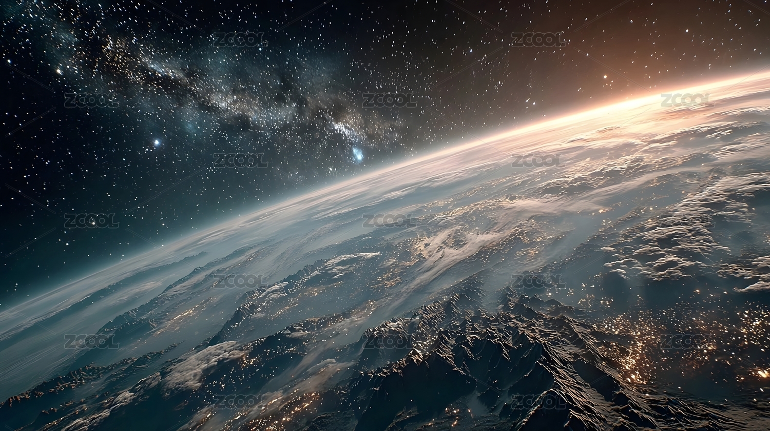 地球夜景与银河交汇的壮丽景象