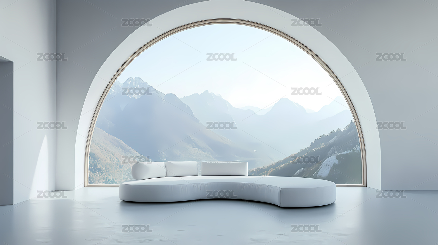 现代极简,客厅,白色沙发,低矮茶几,大窗户,山脉,蓝天白云,自然光线,天窗,通透