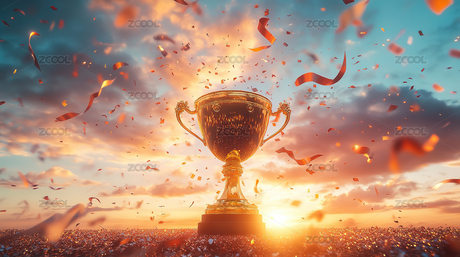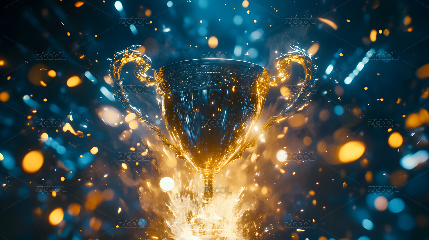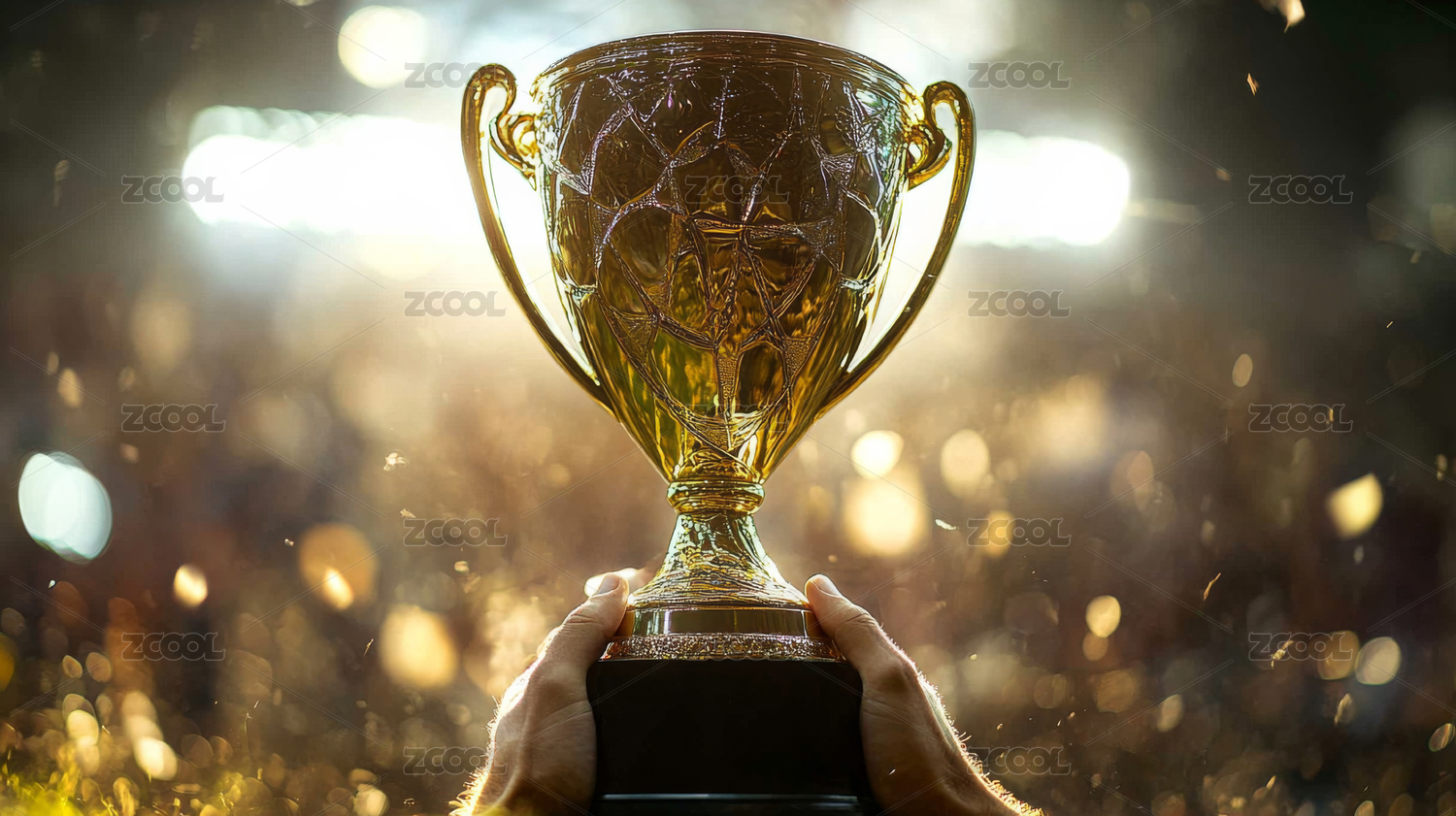 闪亮的金色奖杯与背景夜光散景,比赛冠军成