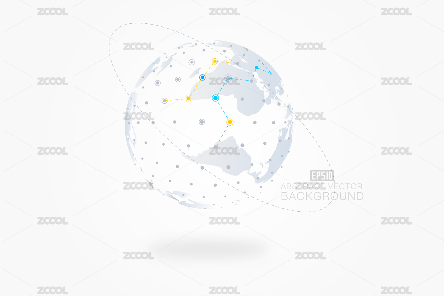 三维抽象矢量星球,寓意全球化、国际化,球形世界地图,点和线连接的矢量背景