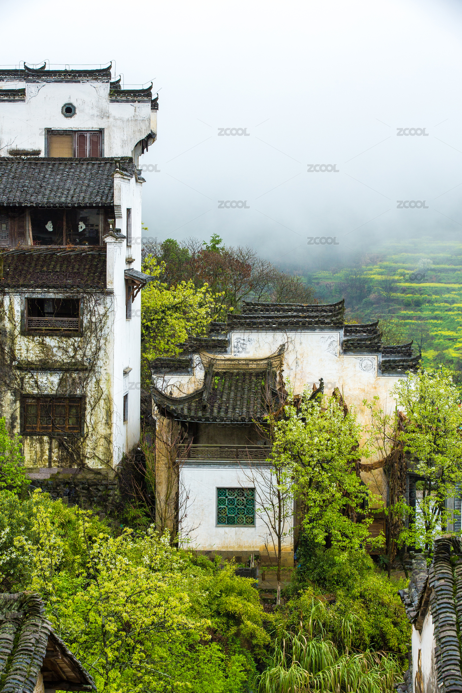中国江西省上饶市婺源县篁岭景区雨雾中的民