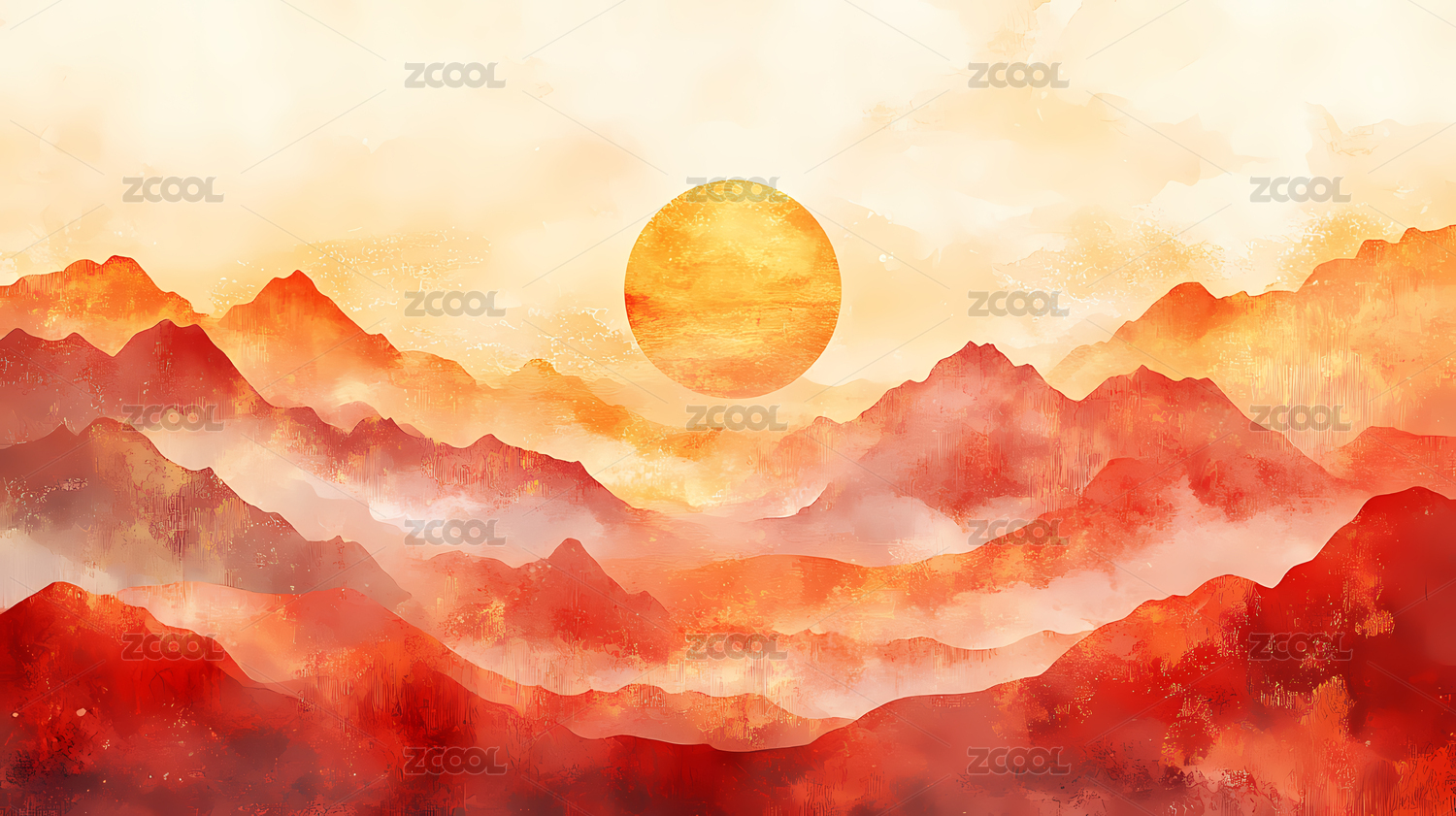 红叶云雾山景水墨画自然风景背景插画