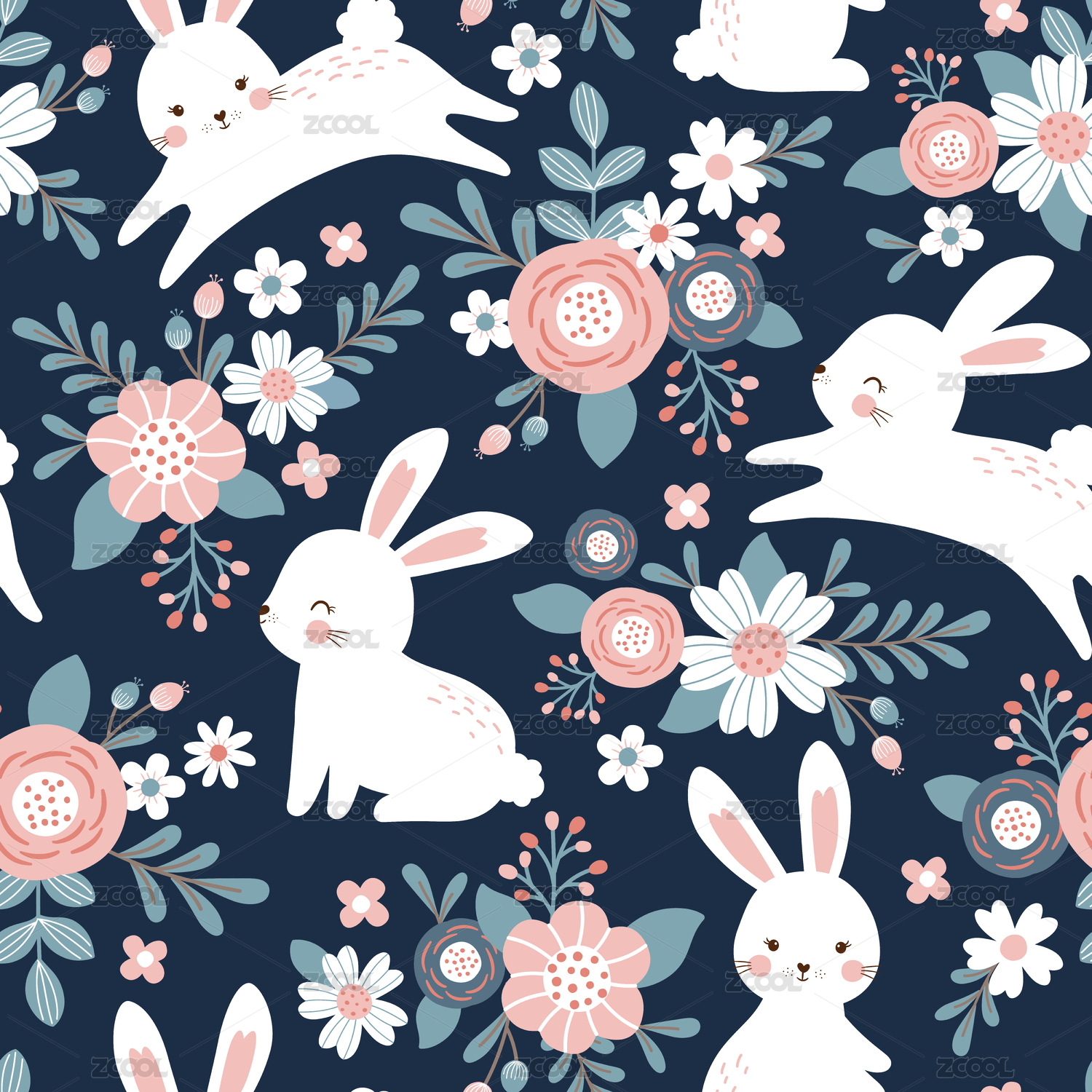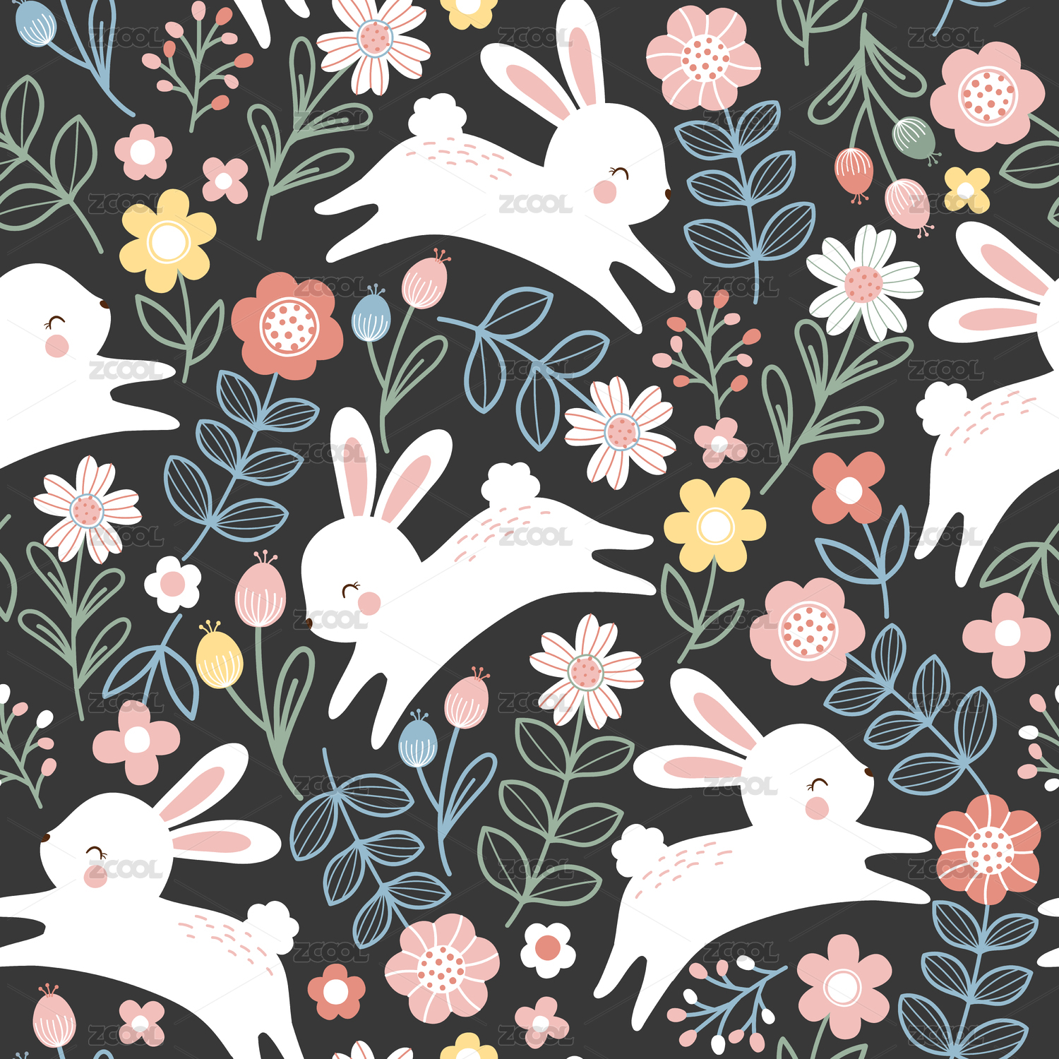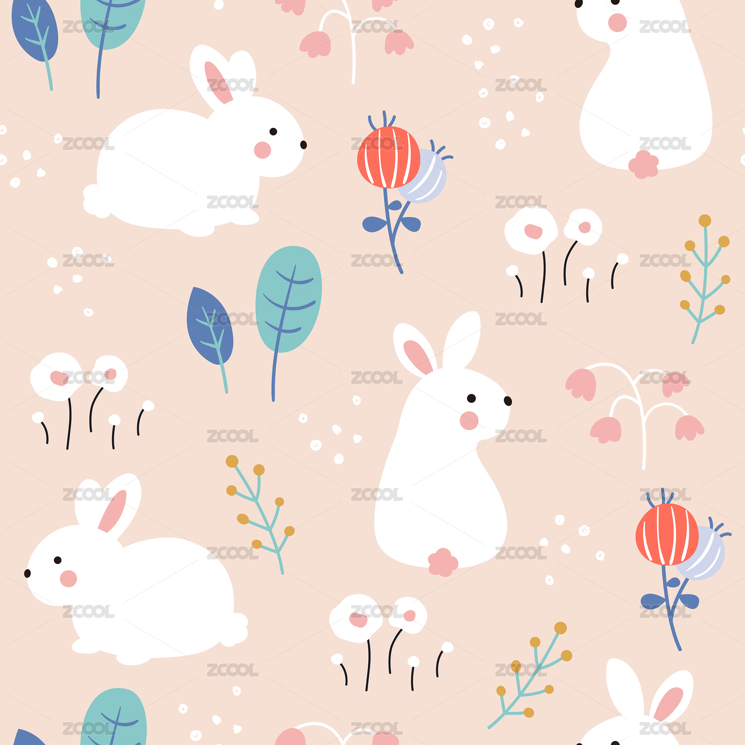 卡通兔子和粉色花朵四方连续童趣图案
