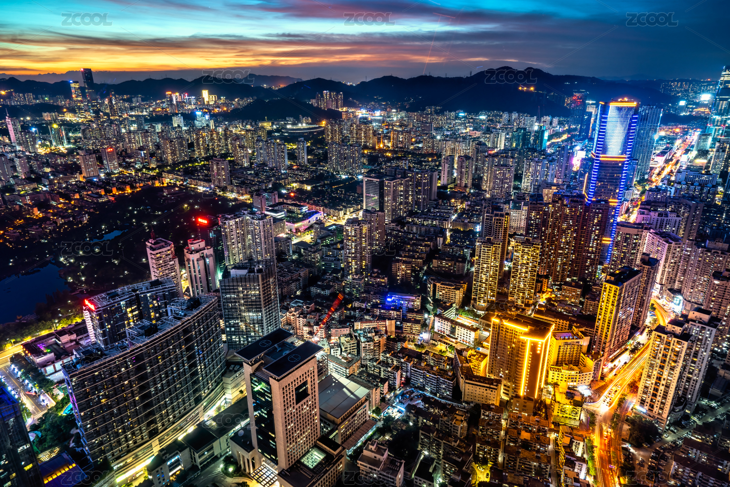 中国深圳塘朗山公园鸟瞰城市夜景建筑