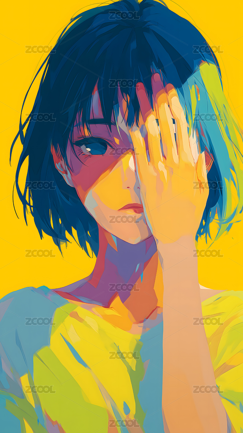 蓝色,红背景,花朵,少女,唯美,悲伤,插画,油画,红蓝,蓝花少女