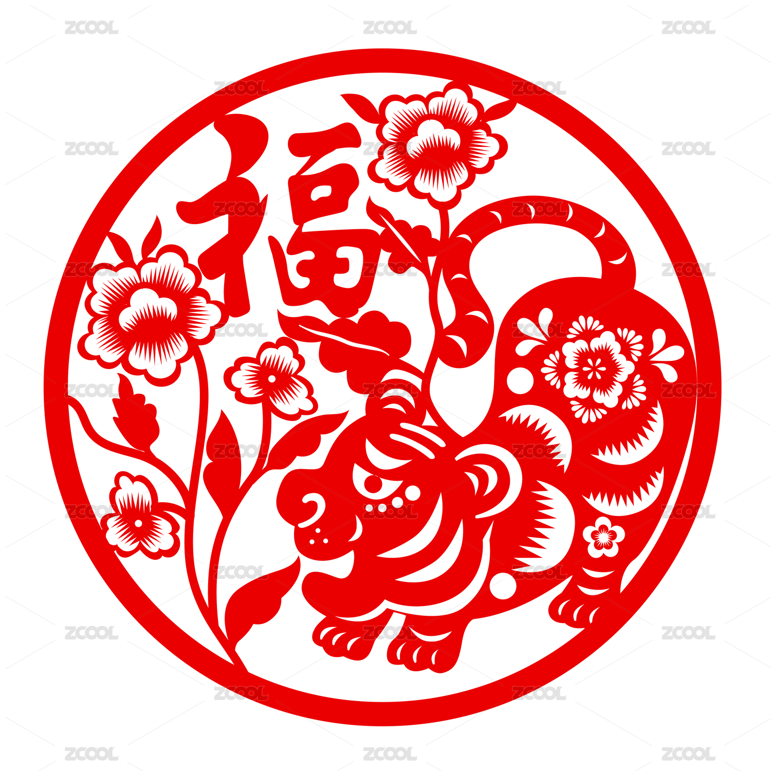 虎年春节十二生肖红色圆形剪纸元素